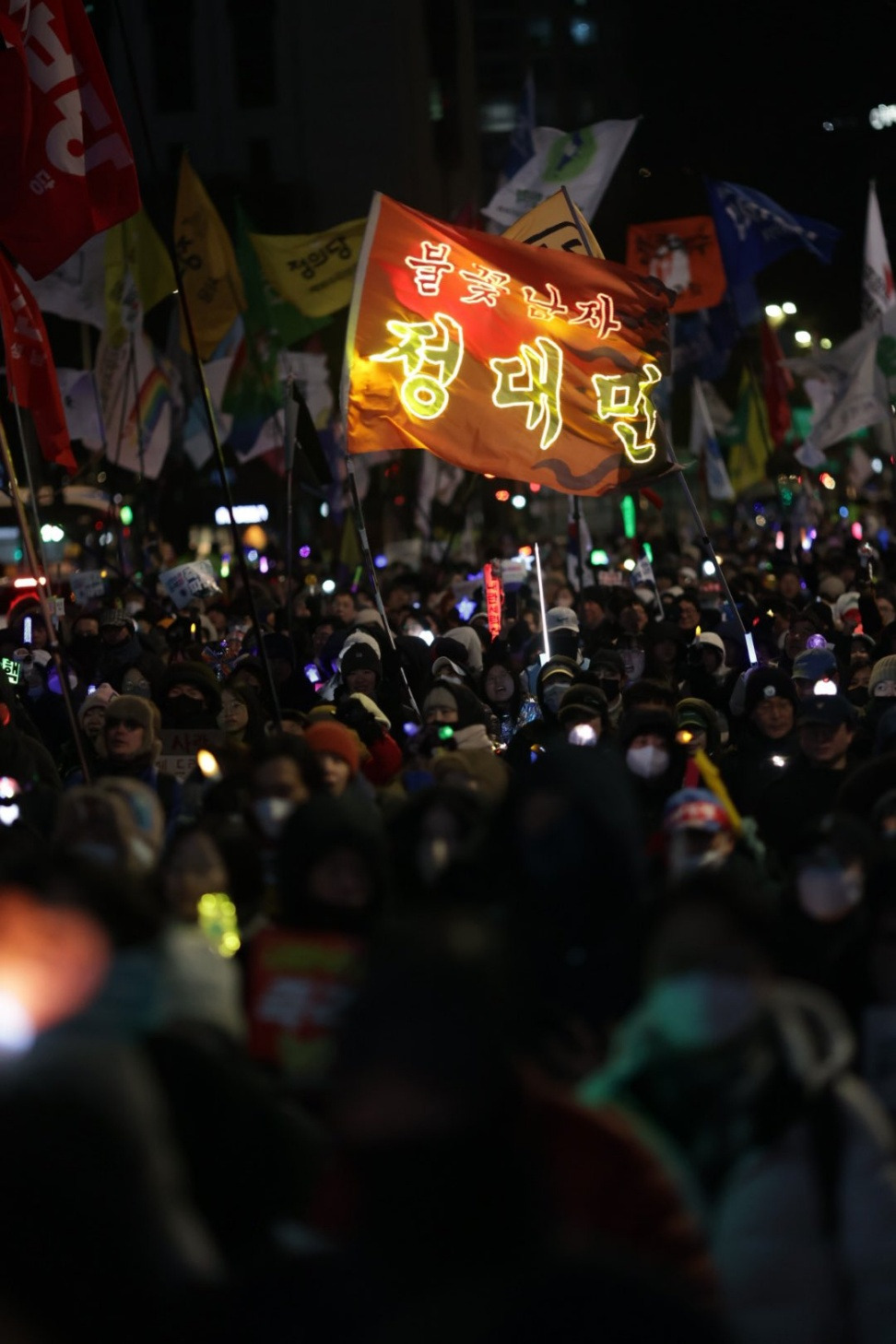 남태령 대첩이 있던 날, 그는 광화문에 처음 깃발을 가지고 나갔다. 계엄이 있기 전, 중국 덕후 친구가 보여준 정대만 생일 응원 영상에 엘이디 깃발이 보였다. 중국에선 흔한 것이라고 했다. 갖고는 싶었지만 딱히 쓸 일이 없어서 잊고 있었다.