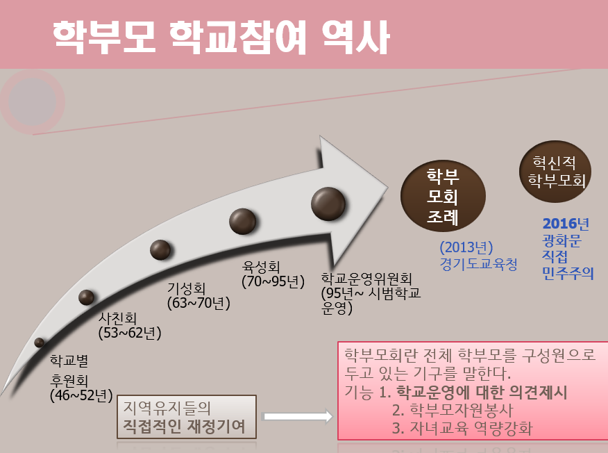 천둥: 우선 학부모회의 역사를 인정하자는 말부터 하고 싶어. 그간의 역사를 아는 것만으로도 나는 큰 힘이 되었거든. 학부모회라는 것이 처음에 어떻게 탄생했고 지금까지 어떻게 변화해왔고 교육청에서는 왜 그렇게 교육 3주체를 강조하게 되었는가를 알게 되면 자연스럽게 다음에는 어디로 나아가야 할지 조금은 알아차릴 수가 있잖아.