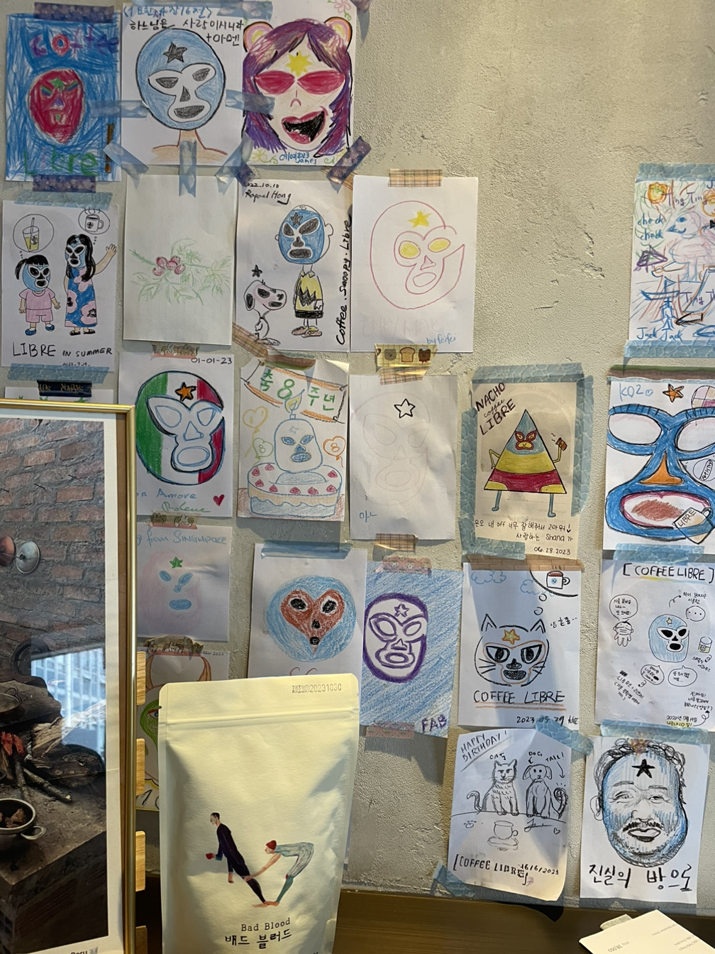 구석 자리에 앉는다. 벽에 붙은 커피 리브레의 마스코트, 마스크를 그린 손님들의 엽서들을 천천히 보며 샌드위치를 베어 문다. 아마추어들의 작품이지만 특색들이 있어 질리지 않는다.