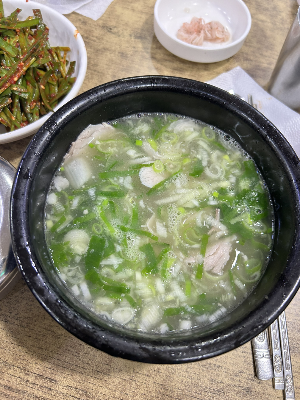 기차를 타고 왔으면 편안히 걸어갔을 부산역 "본전 돼지국밥"인데, 이날은 버스 터미널에서 택시를 타고 갔다. 점심이 한참 지난 3시가 가까운 시간임에도 밖에는 대기 줄이 있다. 안에 들어서자 예전의 그 부산 사투리가 여기저기서 들린다. 약간의 불친절함과 부지런한 직원들의 모습은 그대로다. 먼저 양파, 풋고추, 김치와 부추절임이 식탁에 오르고, 김이 모락모락 나는 돼지국밥이 올라온다. 숟가락을 넣어 후후 불고 한입 먹어본다. 십 년도 넘었는데, 맛이 변함없다. 아내도, 아들도 맛있나 보다. 식구들의 얼굴이 모두 환해진다.