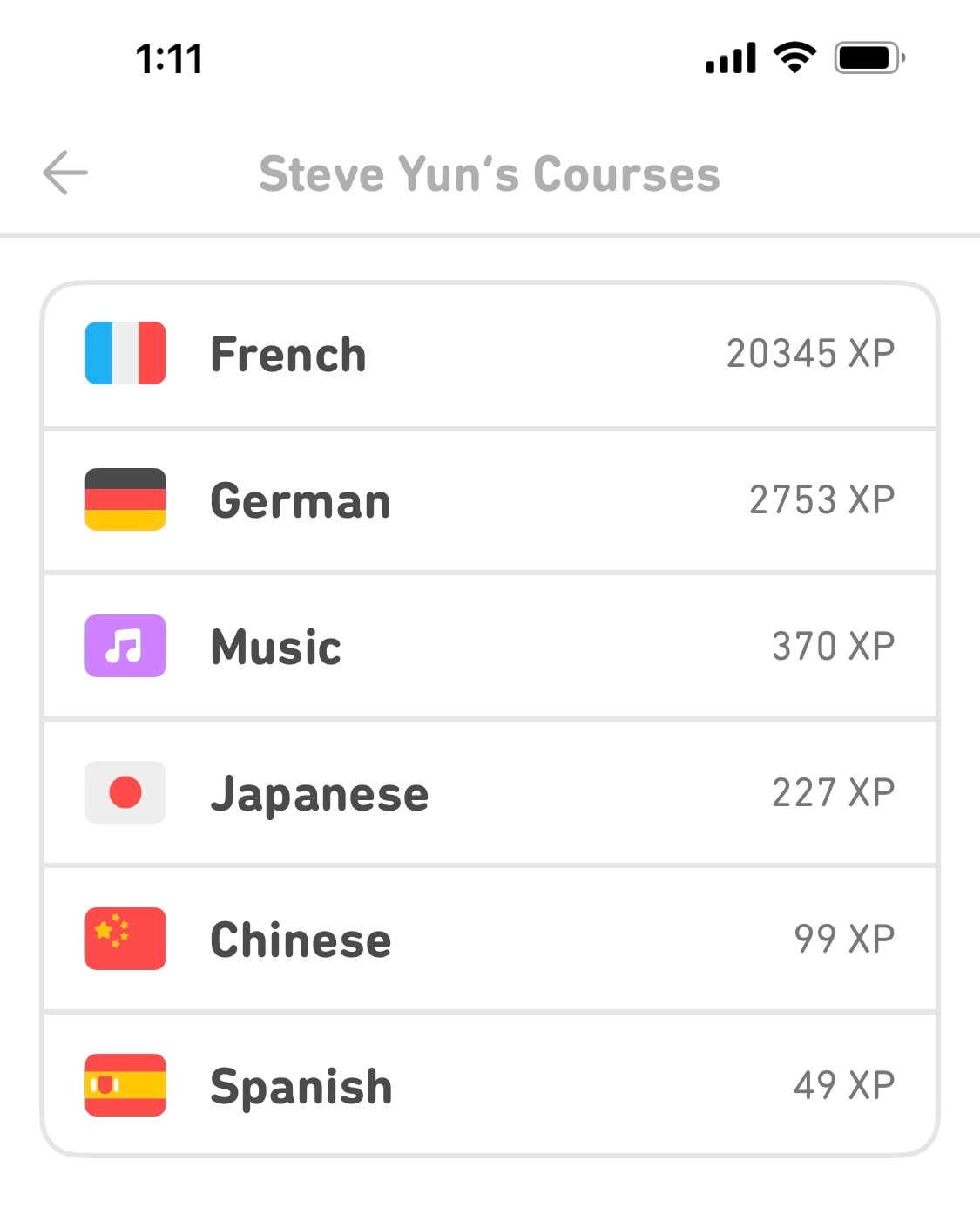 듀오링고? Duolingo는 전 세계에서 가장 인기 있는 언어 학습 앱으로, 매달 약 1억 명의 활성 사용자를 보유하고 있다. 나는 연회원으로 가입했으며, 1년에 87,000원이다. 지금 2년 째 이용 중이다. 나는 484일째 연속 접속 중이다. 내가 듣는 과정은 총 5개인데, 주로 불어 공부에 이용하고 있다. 독일어도 틈틈이 하고 있고, 최근에는 일본어를 시작했다. 음악 과정도 있는데, 호기심에 한번 시도해보고 있다.