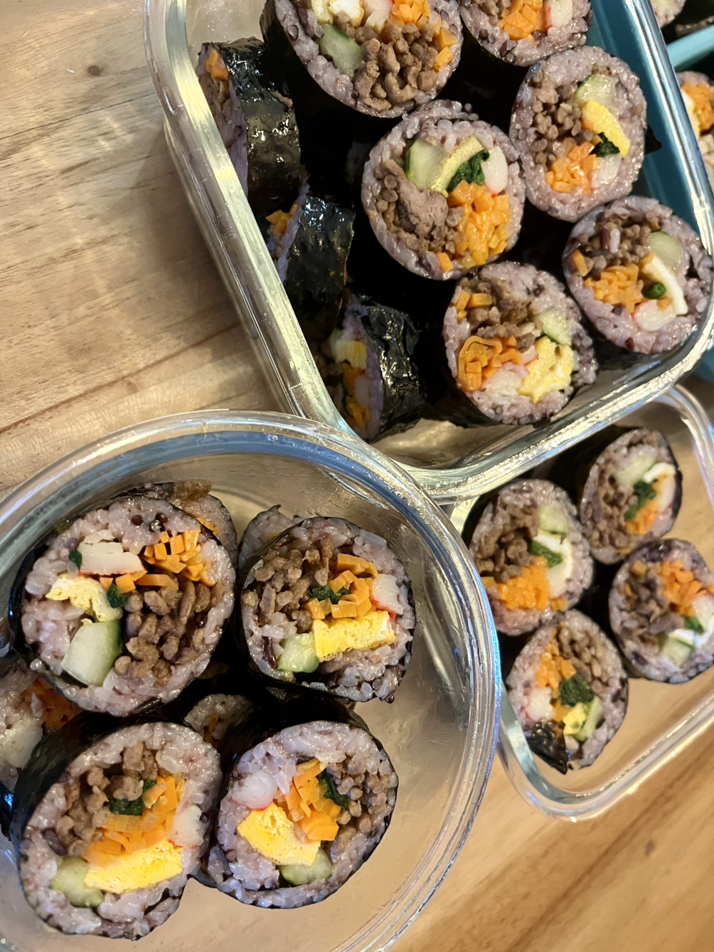 밥을 안치고, 맛살을 볶고, 계란을 부치고, 소고기 양념을 했다.