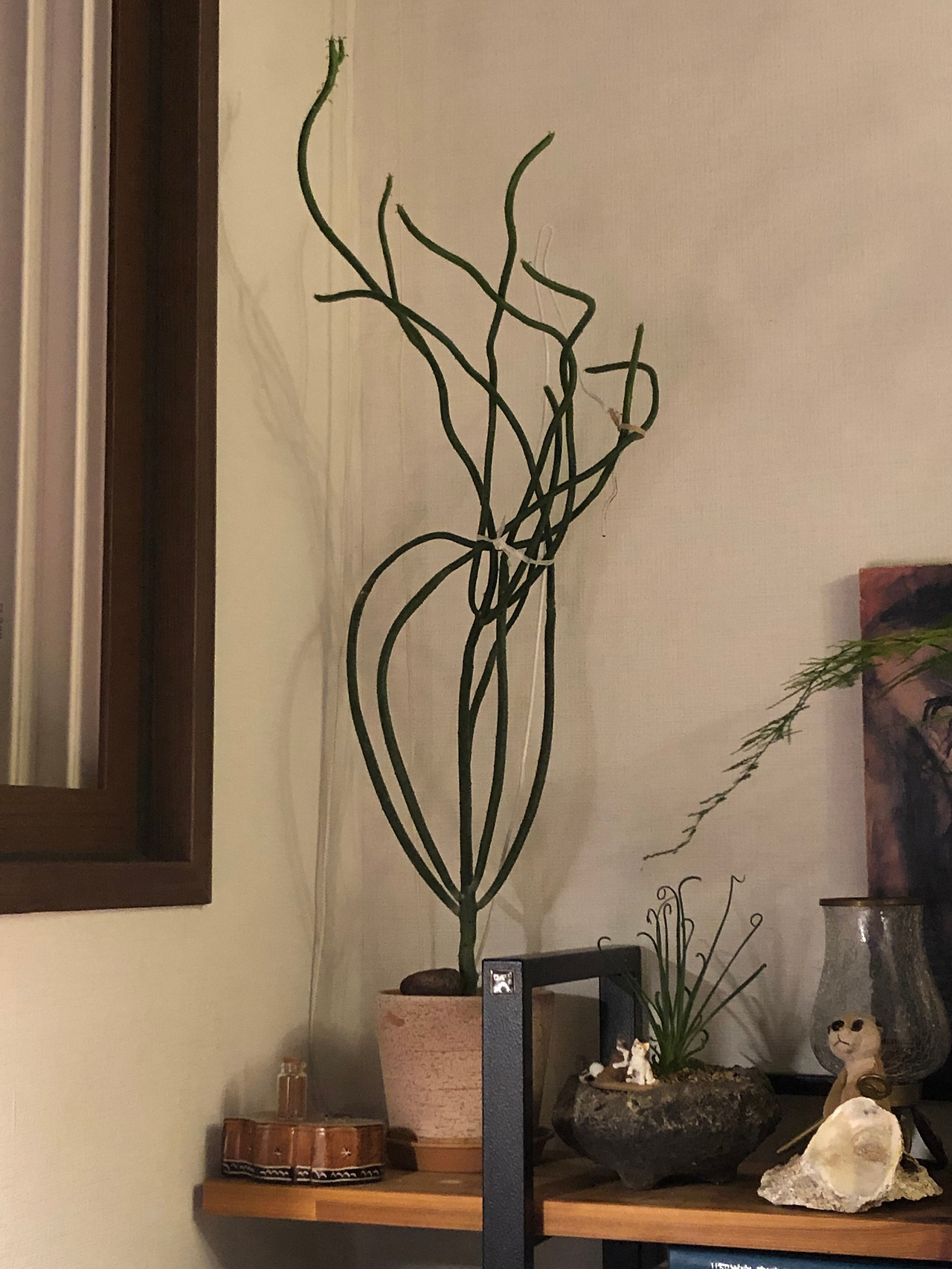 청산호의 파리 날개 같은 작은 이파리들을 보면 기분이 좋다. 단단한 줄기와 어울리지 않아서 웃기고 귀엽다. 최근엔 제일 긴 줄기 끝에 알통 자랑하는 것 같은 팔이 하나 더 생겼는데 그것도 매일 관찰하고 있다. 아스파라거스는 새로운 줄기가 위로 슬금슬금 올라왔다가 옆으로 쑤욱 길어져서는 가시 같은 잎을 짜잔 내는데 그 스피드가 놀랍다. 세로그라피카와 틸란드시아는 더듬이 같은 새 잎이 삐죽삐죽 튀어나온다. 스피랄리스는 키도 많이 컸지만 끝이 동그랗게 말리기 시작했다.