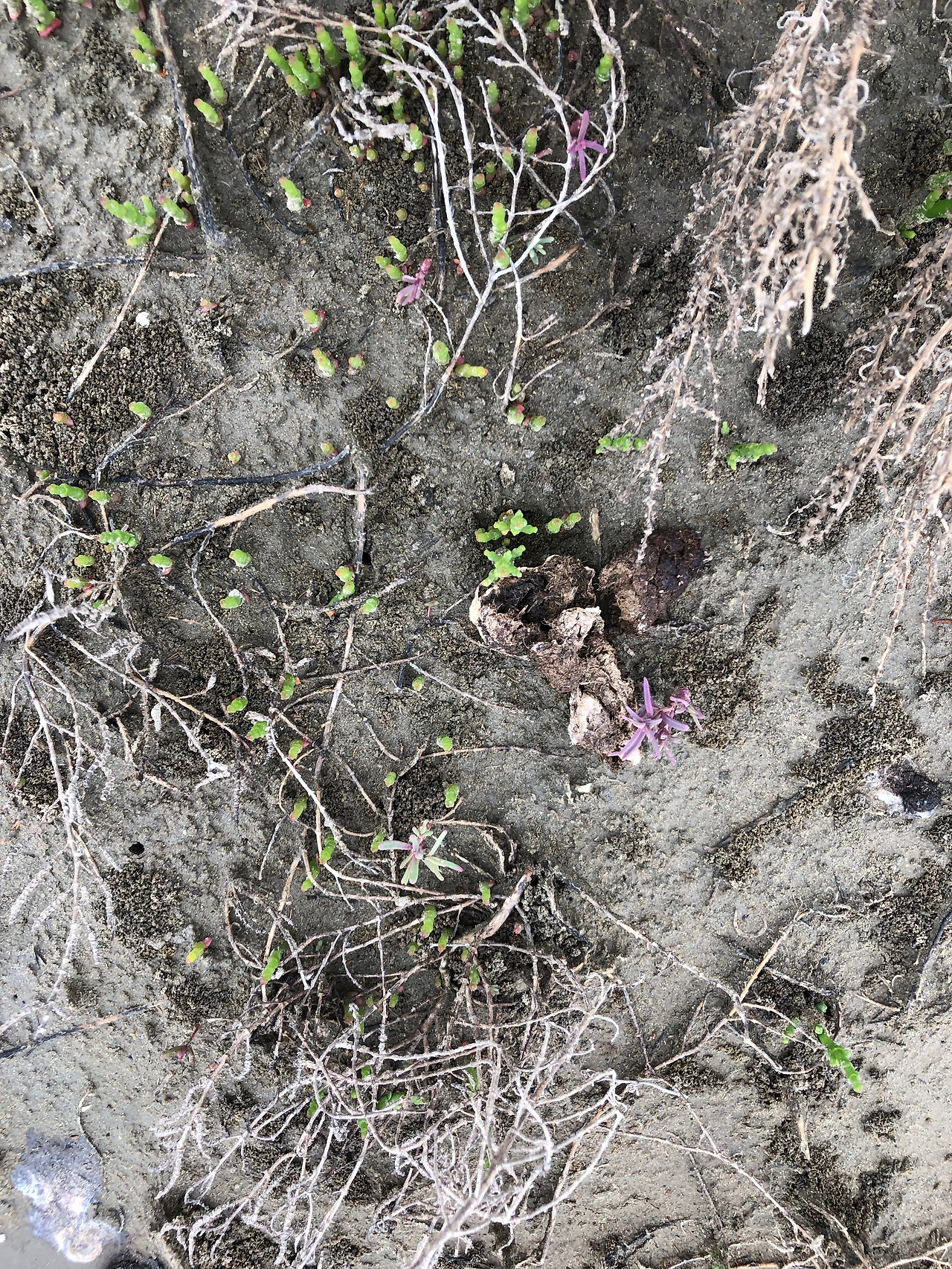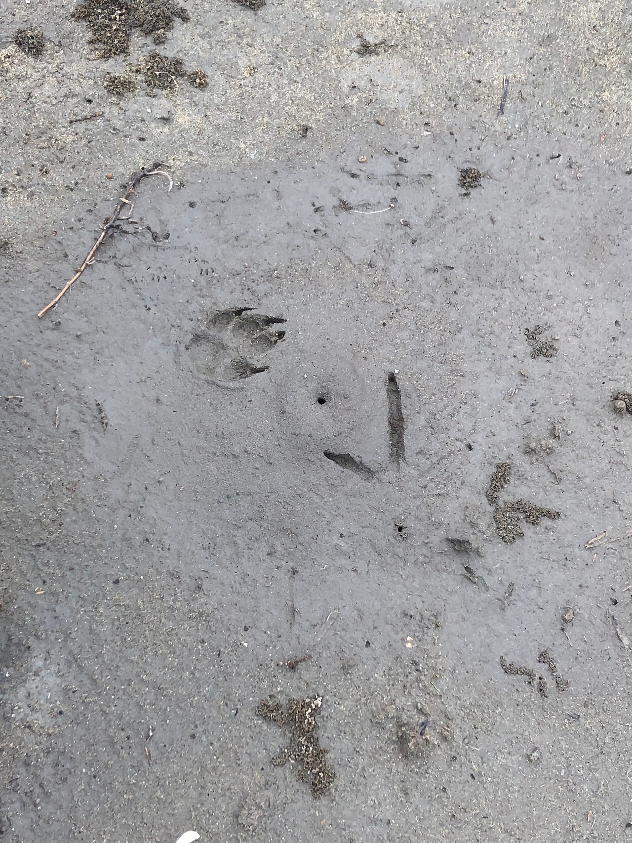 답사는 군산공항 바로 옆 남수라 마을을 지나 한때는 갯벌이었던 곳에서 시작되었다. 물막이 공사 이후 마른 갯벌이 된 땅이다. 미군기지 철조망을 따라 걷다가 염생식물이 서식하는 곳에 도착했다. 첫 똥을 보았다. 갯벌같은 땅이었다. 게들이 뱉어놓은 동글동글한 흙더미도 주변에 있었다. 똥 주변에는 어떤 발자국도 있었다. 찾아보니 너구리 발자국과 닮았다. 똥을 보고 이렇게 반가울 수가 있다니. 찌그러진 4개의 타원형과 날카로운 발톱 모양이 선명하게 찍힌 발자국은 또 어떤가. 왜 한 개만 찍혔는지 궁금해하며 주위를 둘러보다가 아 야생동물이니까 하는 생각이 드니 신기하고 신비롭다.