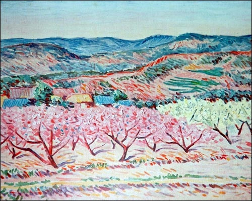 분홍색 꽃이 핀 복숭아나무, 하얀색 꽃이 핀 자두나무가 가득한 밭이 전경에서 눈길을 사로잡는다. 뒤편으로는 파란색 지붕, 초가지붕, 갈색 지붕이 보인다. 그 뒤로는 산이다. 앞쪽 산은 빨강, 노랑, 청록, 분홍, 초록, 검정 등 다양한 색으로 표현이 되었고 뒤로 갈수록 푸른색 위주로 채워졌다. 해가 지는 것인지, 뜨는 것인지 산 뒤로 빛이 어숨푸레 비친다. 아, 해가 쨍하고 뜨지 않은 어두운 하늘빛을 받아 산이 파랑인가. 나무에 그득그득 핀 꽃들은 환한 낮이 아니어도 빛이 나고 눈길을 사로잡는 법이지.