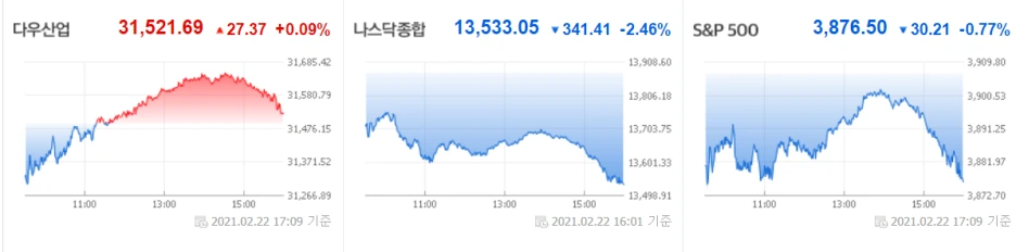 - 미국증시: 나스닥이 2.46% 하락했다. 간만에 큰 낙폭이다. 미국 국채 10년물 금리가 장중 1.394%가 되면서 기술주가 가장 큰 타격을 받았다. 인플레이션에 대한 우려가 반영되어 대형 기술주들이 줄줄이 폭락했다. 테슬라는 무려 8.55% 하락했다. 이번 달 들어 애플의 주가도 11.84%나 하락했다.