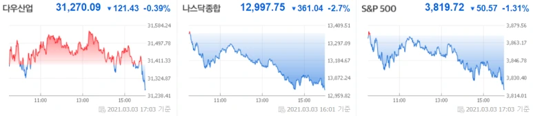 - 미국 증시: 나스닥이 2.7% 하락했다. 저항선으로 여겨지는 1만 3000선 아래로 떨어졌다. 금리가 다시 오른 탓이다. 미 국채 10년물 금리가 1.498%까지 치솟은 영향이다. 계속해서 금리 이슈로 증시가, 특히 성장주가 많이 하락하고 있다. 어제 다우지수는 0.39%, S&P500지수는 1.31% 하락했다.