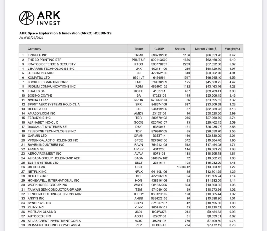 가장 많이 차지하는 종목은 8.47%로 TRIMBLE이다. 트림블은 소프트웨어/하드웨어 서비스 기업이다. 농기구 업체인데 로봇이나 드론에 활용되는 핵심 기술을 가지고 있다. 건설현장에서 사람들이 해야하는 측량 등의 작업을 대신 해주는 기술을 갖고 있다고 한다. 2위로 많이 보유하는 종목은 3D 프린팅이다. 일론머스크의 SPACE X는 안보인다!