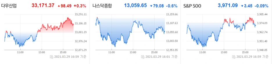- 국내증시: 오늘 코스피는 1.12% 상승하면서 3070.00에 마감했다. 원달러 환율은 2원 오른 1134.5원에 마감했다. 외국인과 기관 모두 매수세가 강했다. 수에즈 운하가 정상화되고, 미국이 3조달러 규모의 인프라 투자를 할 것으로 밝힌 뒤로 경제 회복에 대한 기대감이 작용했다는 분석이다. 미국 국채 10년물 금리가 1.7% 중반까지 상승했지만 주식시장에 큰 변동은 없었다.