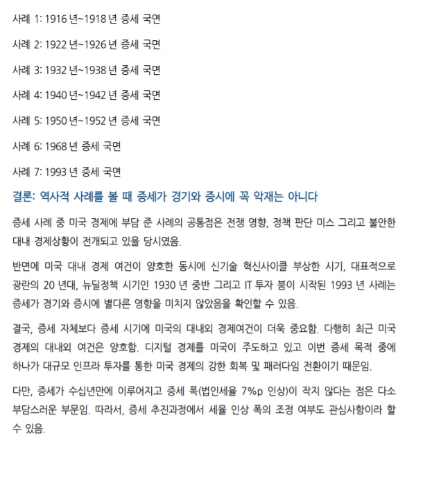 증세 자체보다 증세 시기에 미국의 경제여건이 더 중요하다는 분석인데, 최근 미국 경제 대내외 여건은 양호한 편이다. 디지털 경제를 미국이 주도하고 있고, 이번 증세 목적 중 하나가 대규모 인프라 투자를 통한 미국 경제의 강한 회복 및 패러다임의 전환이기 때문이다.