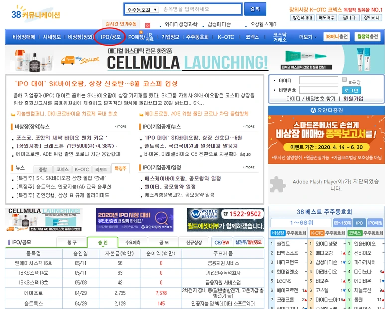 어떤 종목이 상장될 예정인가? 찾아보는 단계. 핫한 공모주 청약이었던 카카오 게임즈, 빅히트, SK바이오팜처럼 뉴스를 통해 정보를 얻을 수도 있지만 나는 공모주 관련 사이트인 38 커뮤니케이션을 이용하는 편이다. 사이트에 접속해서 IPO/공모 탭에 들어가면 상장 예정인 다양한 기업들을 볼 수 있다. 여기서 내가 청약하고 싶은 공모주를 고르면 된다.