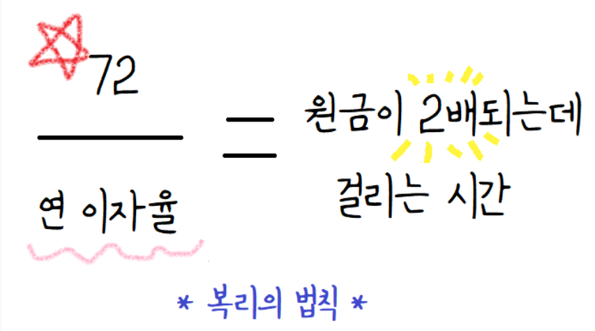 72 나누기 연 이자율 = 원금이 2배 되는데 걸리는 시간이라는 공식이다.