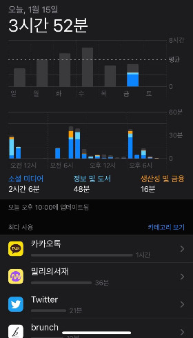 두 개의 선택지 중에 내가 선택할 것도 책 8시간 읽기이지만 이상과 현실은 다르다. 핸드폰 사용 시간을 알려주는 '스크린 타임'이 내가 처한 현실을 말해준다. 오늘 하루 동안 스마트폰을 본 시간은 4시간 남짓이고 밀리의 서재 같은 정보 및 도서 앱은 48분 정도 활용했다. 나머지는 카카오톡, 트위터 같은 앱들이다. 자잘한 앱들 사용 시간을 합치니 쉽게 몇 시간이 되었다.