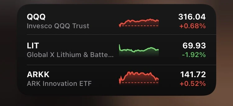 내가 투자하고 있는 ETF 3종 중 QQQ와 ARKK는 소폭 상승, LIT는 2%가량 하락했다. QQQ는 나스닥 지수를 추종하고, LIT는 전기차와 2차전지 관련 테마 ETF다. ARKK는 가장 최근에 소규모로 매수했다. 작년 수익률이 100%가 넘어가는 가장 핫한 ETF인데, 혁신적인 기업에 투자하는 ETF다. 이미 너무 좋은 성과를 낸 ETF에 들어가는게 메리트가 없다는 생각은 들었지만, ARKK가 투자하고 있는 기업들을 보고 조금이라도 사보고 싶다는 마음이 들어서 1월 들어서 3주정도를 매수했다. LIT와 QQQ는 계속해서 하락시 정액분할매수를 할 것 같고, ARKK는 어떻게 할지 좀 더 지켜보고 정하려고 한다.