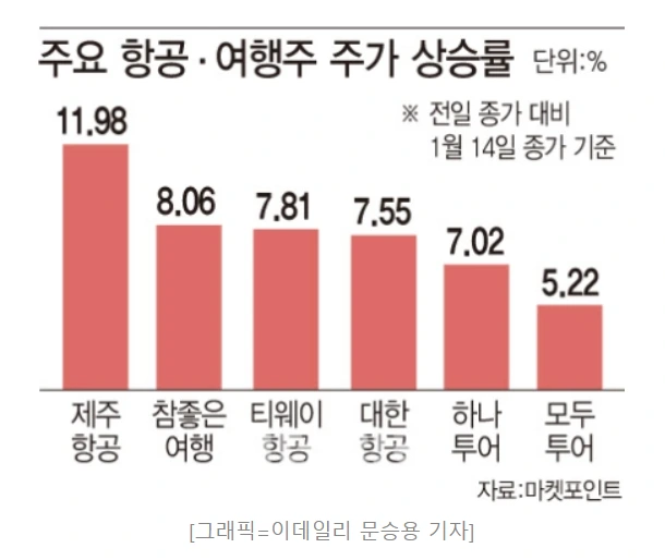 오늘은 항공주와 여행주들의 상승세였다. 셀트리온이 코로나19 항체치료제를 개발했다는 소식과 정부의 백신 무료접종 소식이 합해져 항공/여행주들의 주가 상승을 일으켰다. 제주항공이 12%, 하나투어가 7% 이상 상승하는 등 신고가를 갱신했다.