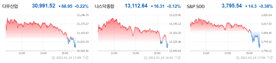 바이든표 부양책이 발표됐다. 규모는 무려 2조. 개인당 2000달러의 현금을 지급하고, 실업 보험과 코로나 백신 관련 내용을 담은 부양책이다. 바이든의 부양책까지는 상승 출발이었지만 파월 의장의 '금리 인상 시점이 가깝지 않아 채권 매입 축소 등 통화완화 정책의 출구를 논할 때가 아니다. 경제 수준이 걱정보다 빠르게 회복할 수 있어 미국에 헬리콥터 머니가 필요하지 않다'는 발언에 하락했다. 트럼프가 샤오미 등 9개의 중국기업을 블랙리스트로 발표한 것도 하락에 한 요인이었다.