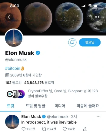 테슬라의 CEO 엘론머스크가 트위터 바이오를 비트코인으로 하면서 비트코인이 가격이 확 올랐다. "In retrospect, it was inevitable"이라는 머스크의 트윗 이후로 14%나 가격이 올랐다. 전에는 공매도 전투를 응원하기도 했는데, 엘론머스크의 트윗 한두개가 증시의 업앤다운을 마구 만들어낸다. 증말 샐럽이다 셀럽~~