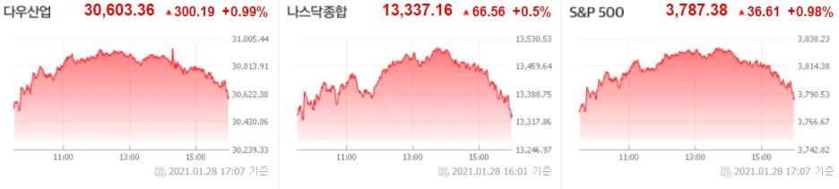 - 미국증시: 어제 나스닥은 0.5% 상승했다. 다우, S&P500 모두 상승하며 마감했다. 미국 4분기 경제 성장률은 4%로 발표됐다. 지난 해 전체로 따지면 -3.5%의 성장률로, 이 수치는 1946년 이후로 최저치라고 한다.