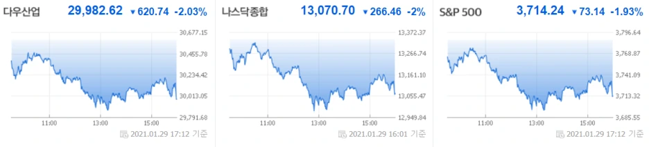 - 국내증시: 코스피도 조정을 겪고 있다. 오늘은 3% 이상 하락해서 코스피 3000선이 깨졌다. 연 초에 너무 급하게 올랐던 것이 조정을 겪는 듯 싶다. 개인은 1조 7086억원을 매수했지만 외국인이 1조 4413억을 매도하고, 기관이 2536억원을 매도했다.