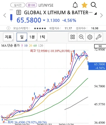 LIT 수익률이 많이 하락했다. 연초 너무 급격하게 상승해주시면서 수익률이 100%대까지 갔던걸 생각하면 30%가량 빠졌다. 장기적으로 봤을때 2차전지 섹터 자체에 문제가 생긴 건 아니라는 판단이 들어 조정이 찾아왔을 때 꾸준히 조금씩 매수하고 있다. 오늘도 2주 추가로 매수했다.