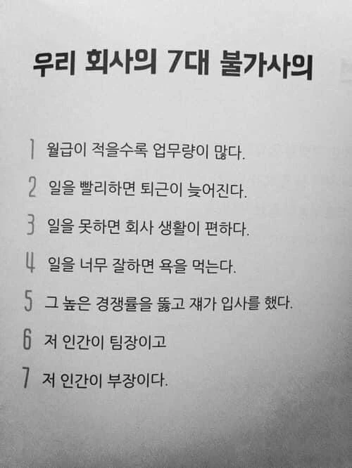 요즈음 SNS에 ‘우리 회사의 7대 불가사의’가 유행합니다. 부가가치를 창출하지 못하는 대한민국 회사 생활의 자화상입니다.