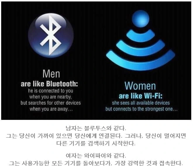 몇 년 된 얘기이지만, 웃자고 하는 얘기 하나. 남자는 블루투스이고, 여자는 와이파이입니다.