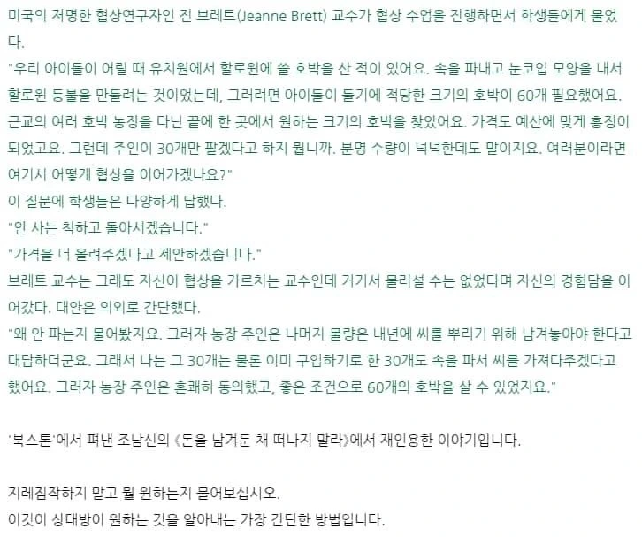 어느 영화에서인가 여자 주인공이 남자 주인공에게 한 말. 소비자 마케팅 분야에서는 정말 유명한 말. 가르쳐주지 않으면, 남자들은 골백번 다시 태어나도 절대로 알아듣지 못하는 말. “내게 필요한 것 말고 내가 원하는 것을 해주세요.” 이 말이 뭔 말인지 알겠지요. 자기가 말하지 않아도 자기가 원하는 것을 알아서 해달라는 뜻입니다. 즉, 평소에 관심을 갖고 잘 관찰해달라는 뜻입니다. 필요한 것을 받으면 감사합니다. 원하는 것을 받으면 감동합니다. 이 차이입니다.