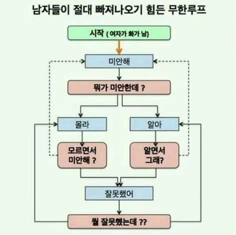 와이프와 함께 외출하고 돌아왔는데, 와이프가 말도 안하고 화가 나있습니다. 이거 못 달래면 사망인데, 남편은 아래와 같은 무한루프에 걸립니다. 비극은 멀리 있지 않습니다. 침묵도 답이 아닙니다, 이 경우는.