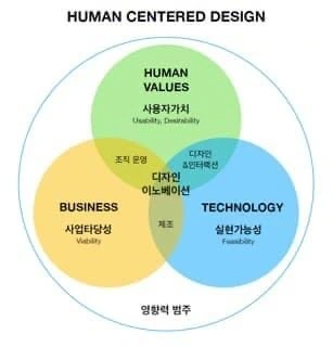 위디엑스 이종원 대표의 Human Centered Design 그림으로 설명하면 힌트가 있습니다. 어떤 사람은 비즈니스의 전문가입니다. 어떤 사람은 기술의 전문가입니다. 그리고 어떤 사람은 사용자 가치의 전문가입니다. 하지만 각각에서 탁월성은 나올 수가 없습니다. 탁월성은 그 셋이 만나는 지점, 즉 디자인 Thinking 또는 Design Innovation에서 발생합니다. 어느 누구도 혼자서는 탁월할 수 없습니다.