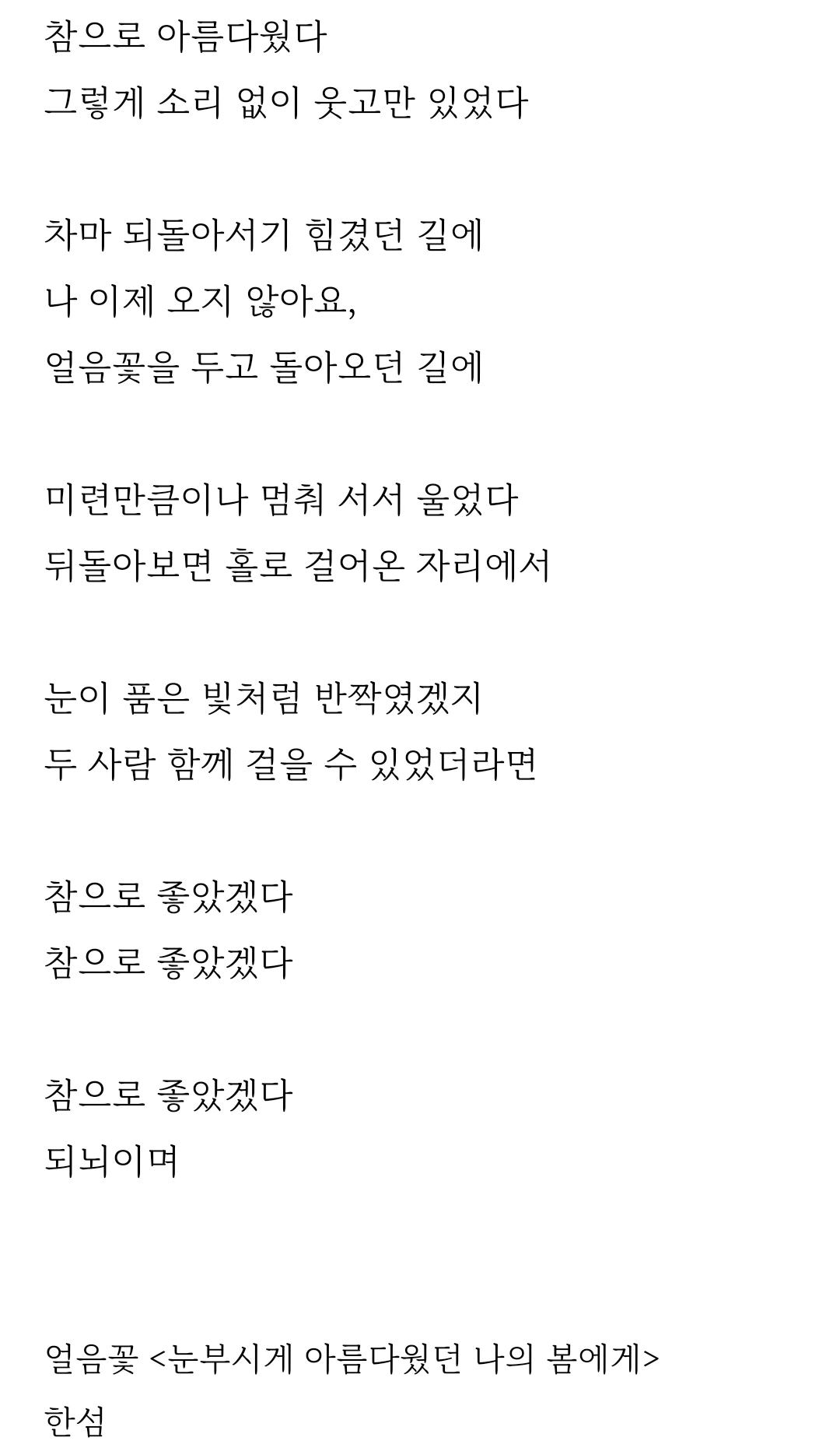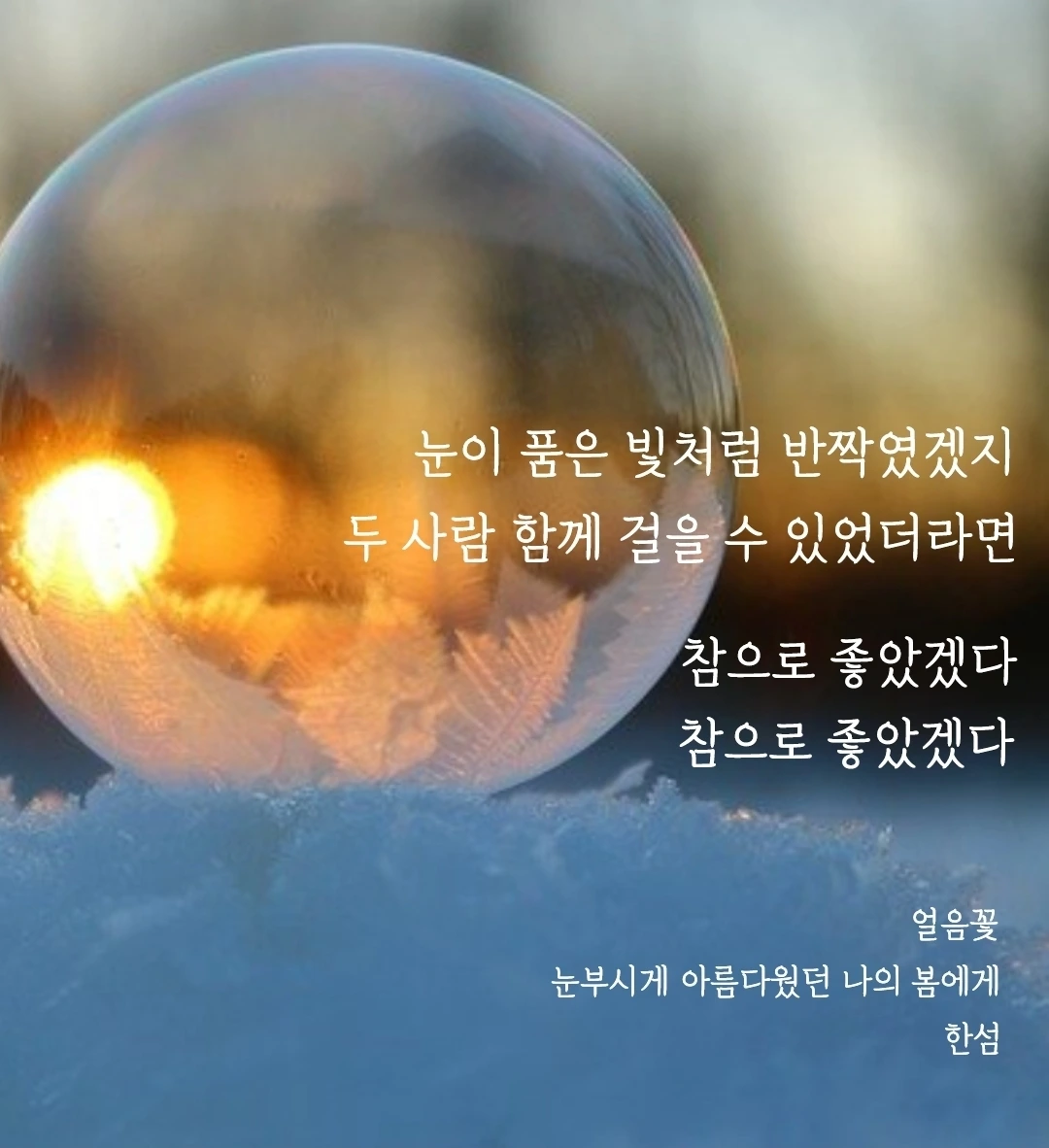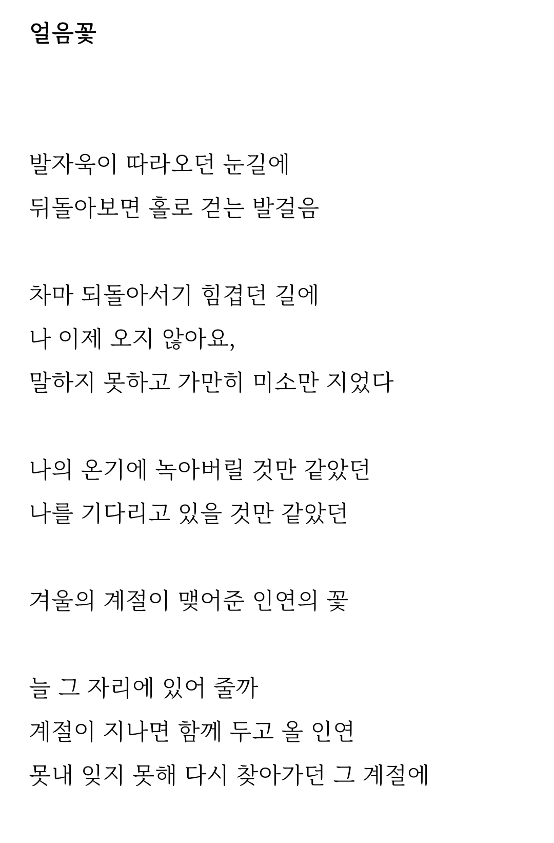 소개해 드린 시는, 시집 [눈부시게 아름다웠던 나의 봄에게] 겨울 챕터에 수록된 ‘얼음꽃’의 일부입니다.