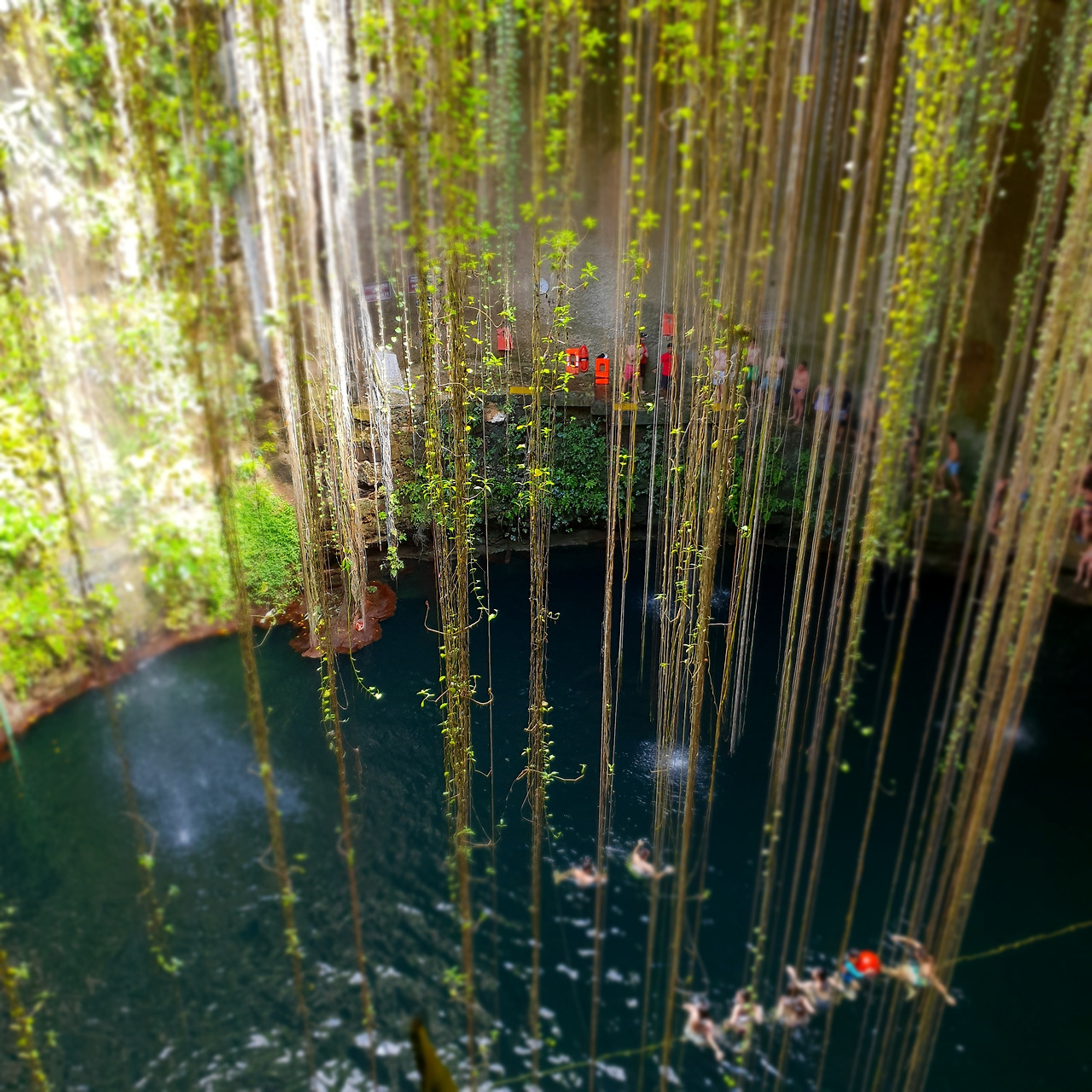 다음으로 간 곳은 익켈세노떼, 세노떼란 마치 싱크홀 같은 지형에 물이 찬 것으로 유카탄 반도에서만 나타나는 지형의 형태라고 한다. 상당히 많은 세노떼가 있는데 그중에서 우리가 간 곳이 가장 유명한 곳이라고 했다. 들러서 밥을 먹으며 혼자 온 다른 여행자 분과도 어느새 친해졌다. 난 사실 물을 무서워한다. 무릎 이상이 한계기에 수영은 하지 않고 발만 담거야지 하는 생각으로 세노떼로 향했다. 그런데 세노떼가 마치 반으로 자른 페트병에 물을 담아놓은 느낌이라 상당히 깊었고 발을 담글 수 있는 형태가 아니었다. 깊은 물에서 수영하거나 구경만 하거나 둘 중 하나를 골라야 하는 것이었다.(구명조끼라는 선택지도 있긴 했지만 그렇게 까지 들어가 보고 싶진 않았다.) 당연히 난 구경만 했다. 몇몇 멋진 사람들은 다이빙을 하는 등 나로선 상상도 못 할 과감한 도전들을 하고 계셨다.