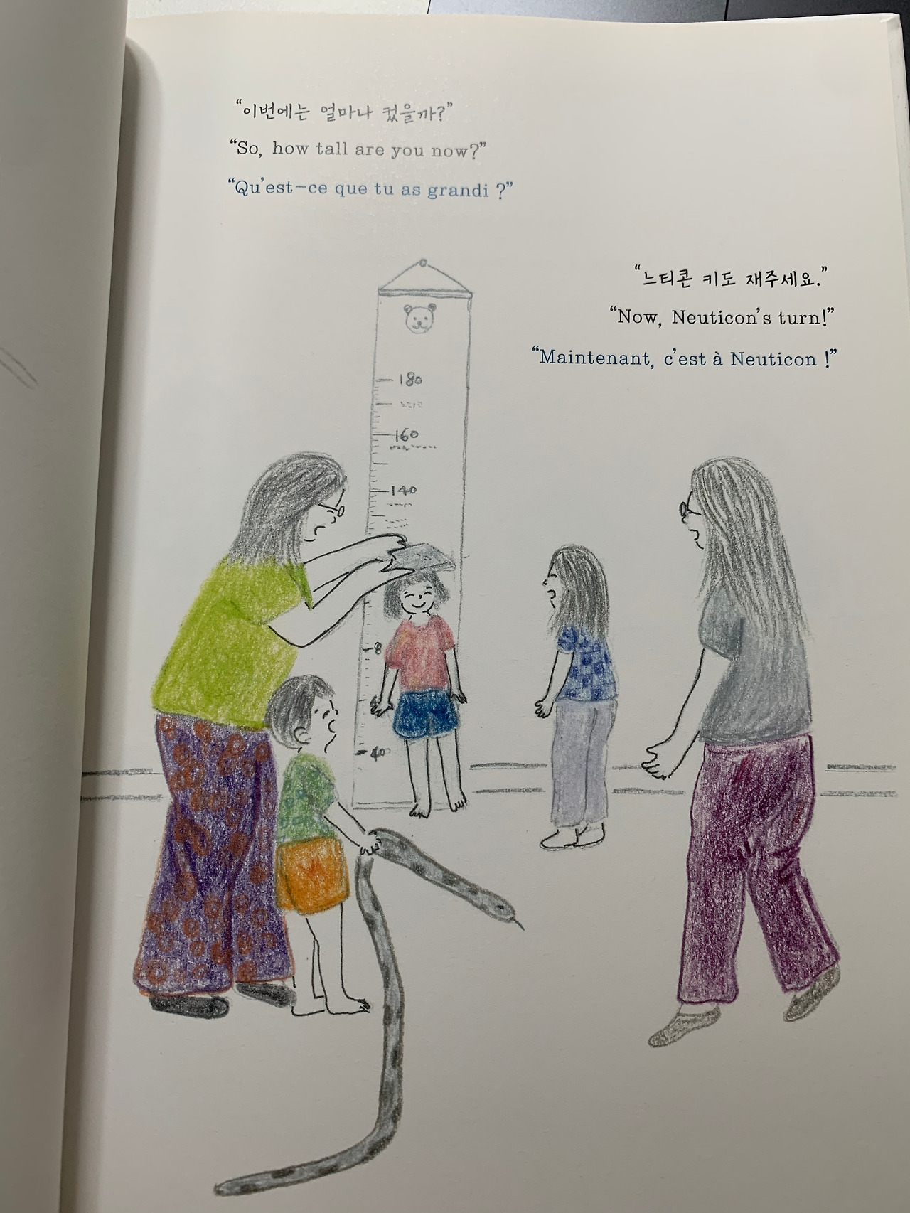 그즈음 도서관에서 그림책 만들기 프로그램이 생겨, 그때 기억을 더듬어 그림책을 만들었다. 지금 생각해도 정말 잘한 일이다. 그림책이 나오자 벨기에에 사는 큰딸에게 부탁하여 불어, 영어, 한국어로 낭독하여 영상으로 남겼다. 흔쾌히 낭독과 녹음해 준 사위와 딸이 고맙다. 가끔 들어보는 데 들을 때마다 행복하다.
