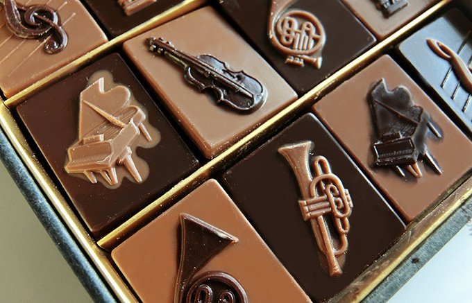 '멜로디'는 포장지에 리본, 'X'mas 스노우 크리스탈'은 크리스마스를 연상시키는 은색 상자에 리본이 장식되어 있다. 리본을 풀고 상자 덮개를 열면 '멜로디'는 그 이름이 나타내듯이 악기들과 높은음자리표 모양이 있다. 다크 초콜릿과 밀크 초콜릿의 두 종류인데 각각의 그림은 다크 초콜릿에는 밀크 초콜릿, 밀크 초콜릿에는 다크 초콜릿으로 조합하여 표현되고 있다. 이 그림이 입체적이고 정교해서 탄식이 새어 나올 정도다. 높은음자리 이외의 악기를 들어보면 바이올린, 피아노, 호른, 하프, 트럼펫. 높은음자리에는 정확히 오선지도 그려져 있다.