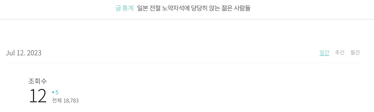 긴장 속에 브런치 첫 글을 올리고 잠든 다음날. 나는 경악을 금치 못했다. 블로그 시절에는 글 하나에 조회수 100을 모으기도 힘들었는데, 첫 글이었던 '일본 전철 노약자석에 당당히 앉는 젊은 사람들'이 총 조회수 18000회를 넘은 것이다. 브런치에서 유독 좋아하는 해외에 관련된 주제였기에 다음 메인에 노출되었고, 그것이 조회수를 높여준 것이었다. 그럼에도 굉장히 감격스러운 순간이었다. 그러면서 다음 글을 쓰는 것이 주저되었다. 다음에는 그렇게 조회수가 안 나오면 어떡하지? 다시 옛날로 돌아가버렸다.