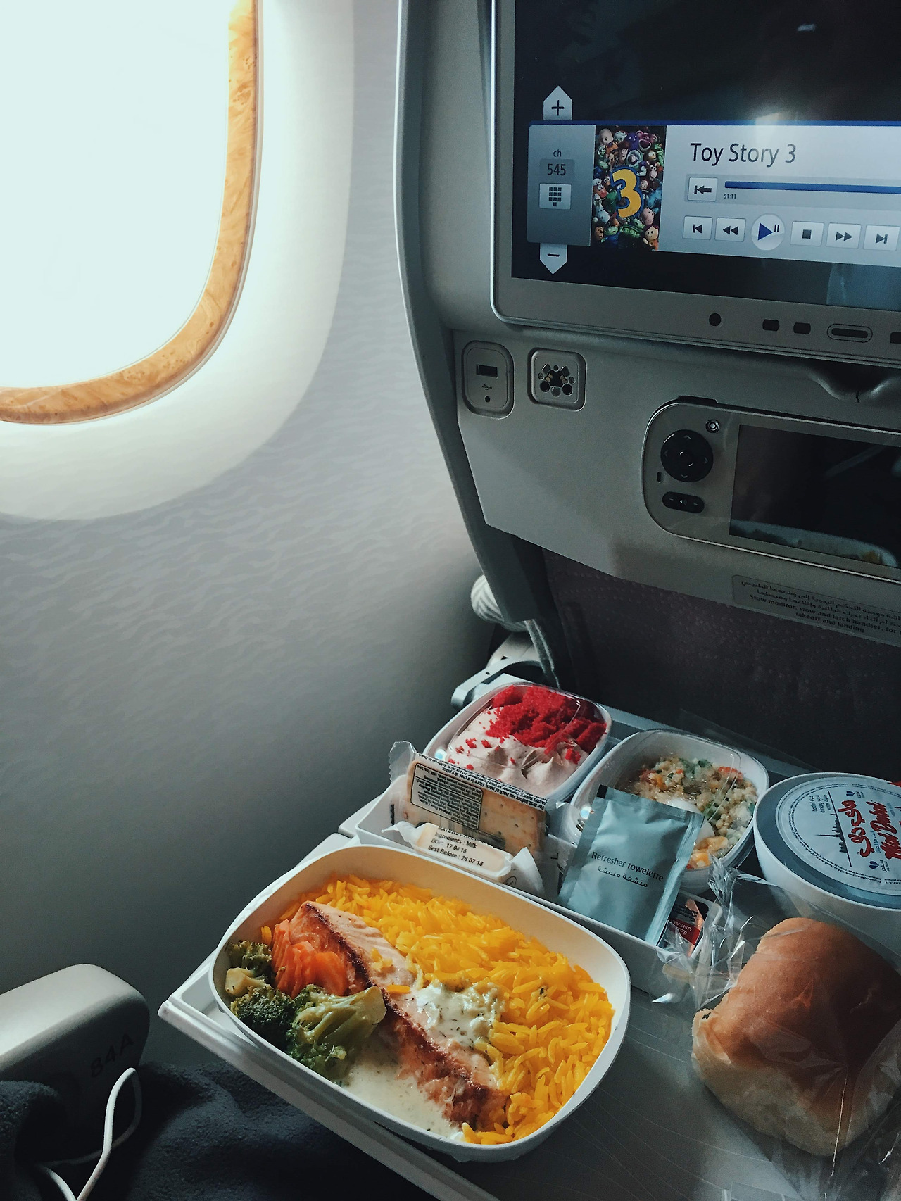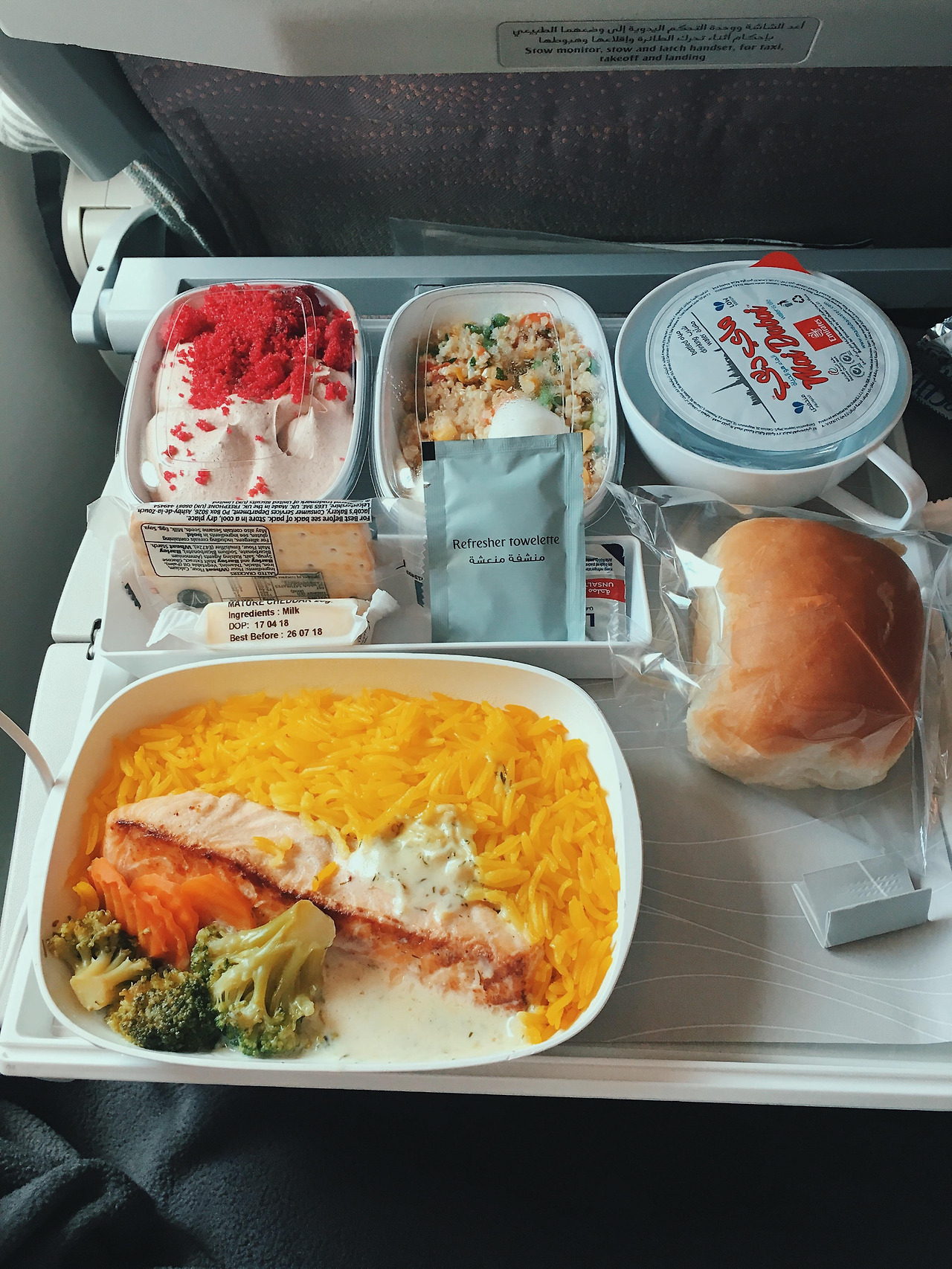 중동 항공사답게, 당연히 기내식도 할랄 푸드였다. 처음 먹어보는 할랄 푸드, 그것도 기내식으로. 남편은 기내식은 별로 좋아하지 않는다고 몇 숟갈 뜨다가 말았지만, 나는 꽤 맛있어서 깨끗하게 잘 먹었다.