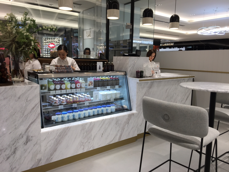 1층엔 마놀로 블라닉 등 구두 가게가 있고, 지하에는 화장품 판매점들 사이에 오가닉 카페인 <엘르 카페>가