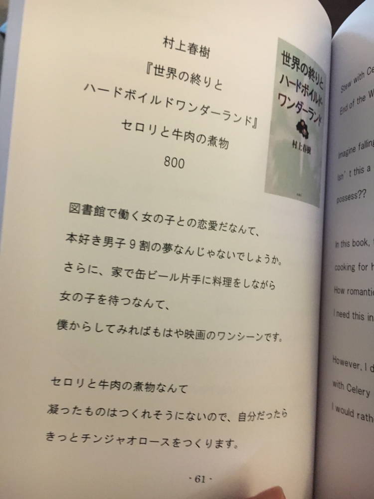 무라카미 하루키의 <세계의 끝과 하드보일드 원더랜드>에 나온 셀러리 소고기 조림도 맛볼 수 있다. 한국어 판에는 셀러리 소고기 찜이라고 번역했는데, 오역이다. 煮物(니모노)는 조림을 뜻한다. 소고기와 쌉싸름한 셀러리가 식욕을 돋군다.