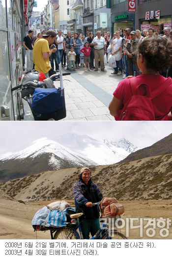 "제발 목숨만 붙어 있기를…." 램프의 요정이 소원을 하나 들어준다면, 그거뿐이었다. 부산에서 강릉으로, 중국 대륙, 홍콩을 거쳐 인도, 파키스탄, 이란, 터키를 지나 카스피 해를 노를 저어 건너니 어느새 유럽 대륙에 닿아 있었다. 불가리아, 독일, 네덜란드, 벨기에, 영국, 프랑스, 스페인, 포르투갈을 거쳐 이탈리아까지 총 43개국을 여행했다. 유럽까지 오는 데 10년이 걸렸다. 중국에서 우연히 얻은 자전거가 그의 발이 되어주었다. 게다가 그 자전거는 거창한 마운틴바이크도 아닌, 일반 자전거였다.