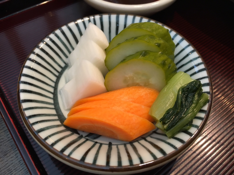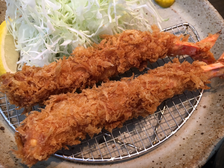 둘째는 새우 튀김에 빠져, 추가로 하나 더 시켰다. 된장국이 아카미소(빨간된장)이고 두부가 들어있다. 느끼함을 씻어주기 위해 깔끔한 아카미소를 쓴 것 같다. 내가 좋아하는 누카즈케 채소도 맛있고.