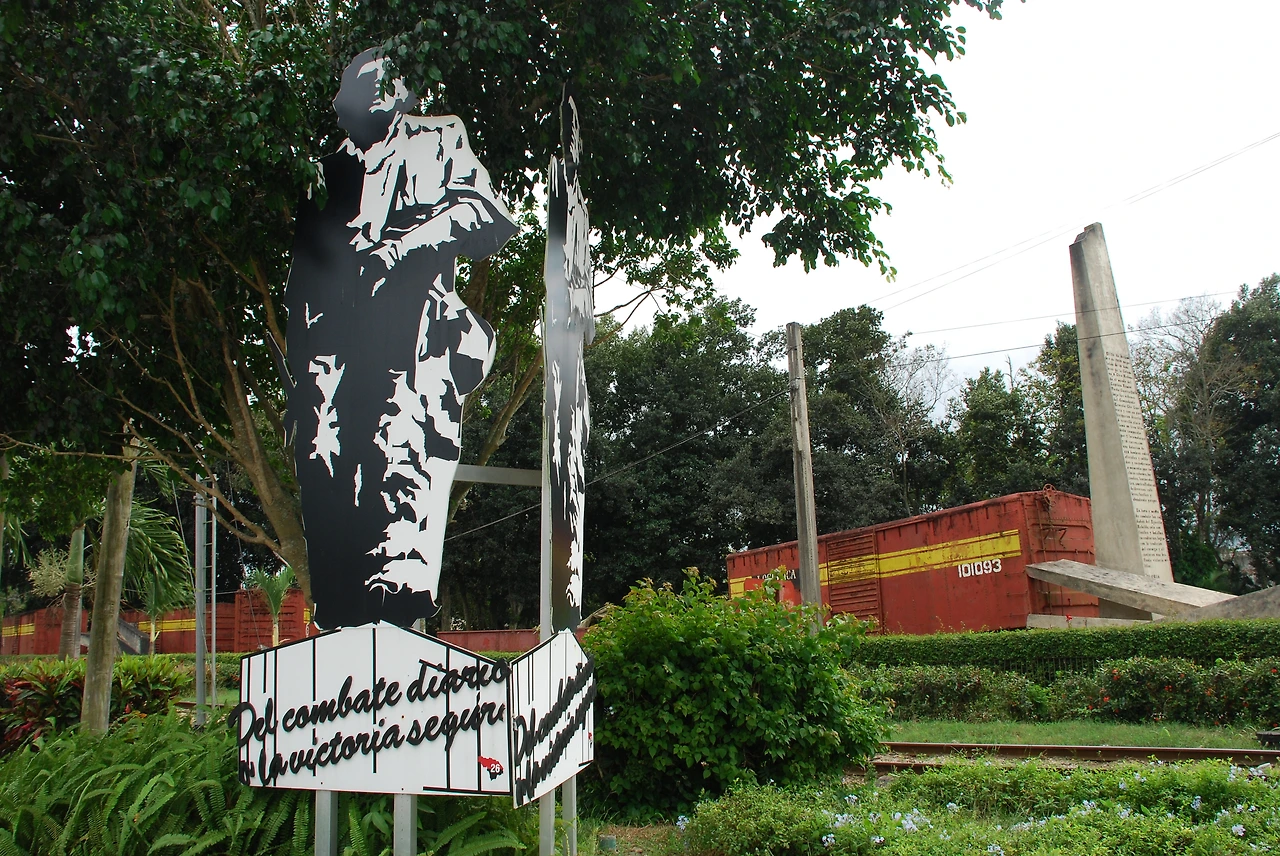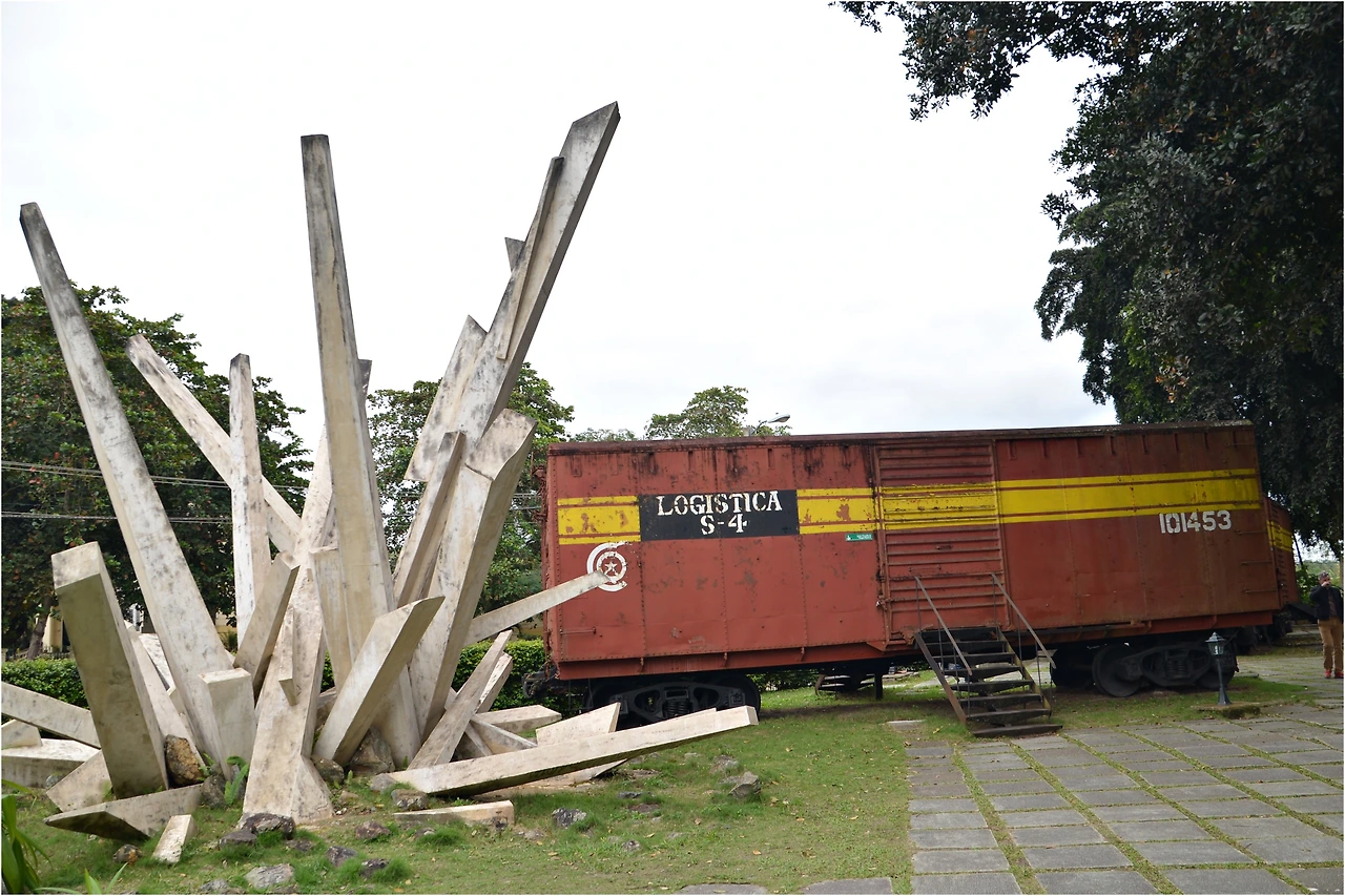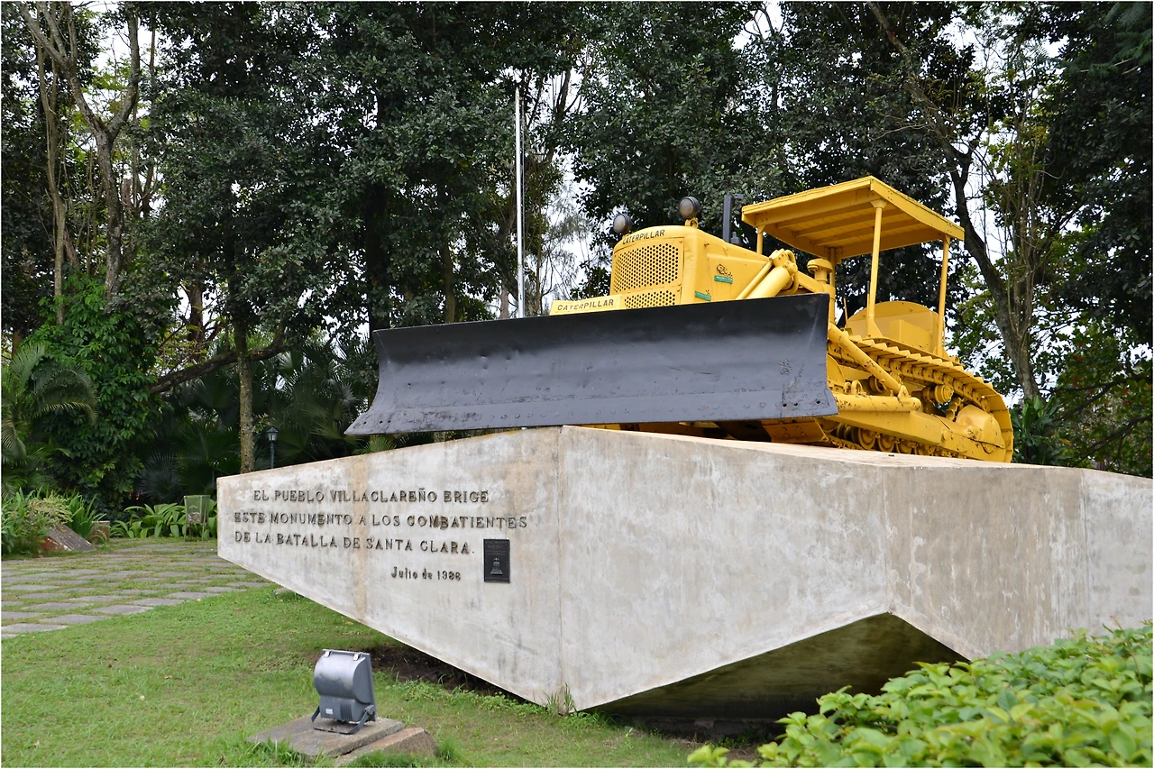 식사를 마치고 차를 타고 근처에 있는 ‘무장열차 기념비(Monumento a la Toma del Tren Blindado)’로 이동했다. 쿠바혁명의 분기점이 되었던 전투가 있었던 곳이다. 1958년 혁명군의 기세를 잠재우기 위해 당시 바띠스따 정부군이 반격을 계획하고 이를 지원하기 위해 무기와 병력을 실은 열차를 아바나를 향해 보내고 있었고, 이 정보를 입수한 체 게바라 군대가 12월 29일 산타끌라라에서 불도저로 선로를 끊고 열차를 탈선시킨 후 몇 시간의 교전을 벌였고 끝내 승리하였다. 그 결과 열차 안의 모든 무기들은 체 게바라의 군대로 넘어갔고 열차에 탑승했던 373명의 군인들이 모두 투항하고 체 게바라 혁명군에 가담하면서 이를 발판으로 혁명군은 승기를 잡게 되었다고 한다. 역사의 흐름에서 변곡점이 되는 순간에는 항상 그 계기가 되는 사건이 있는데 여기가 그곳이 아닐까 하는 생각이 들었다. 이곳에는 당시 사용되었던 불도저와 열차, 기념비 조형물 등을 볼 수 있었다. 기념비 조형물에는 당시의 영웅들을 기리는 문구가 새겨져 있었다.