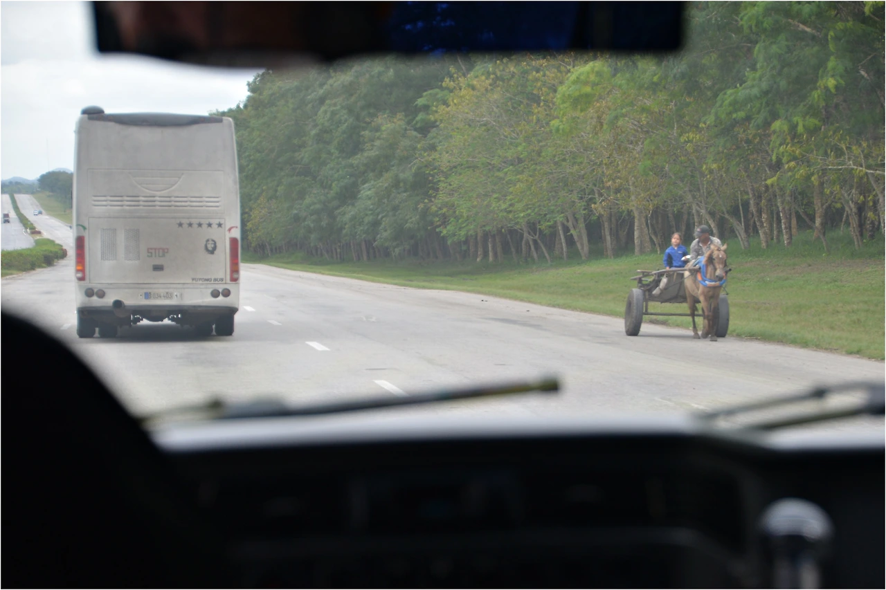 차 안에서 찍은 쿠바 고속도로의 풍경. 마차의 역주행이 너무나 자연스럽다.