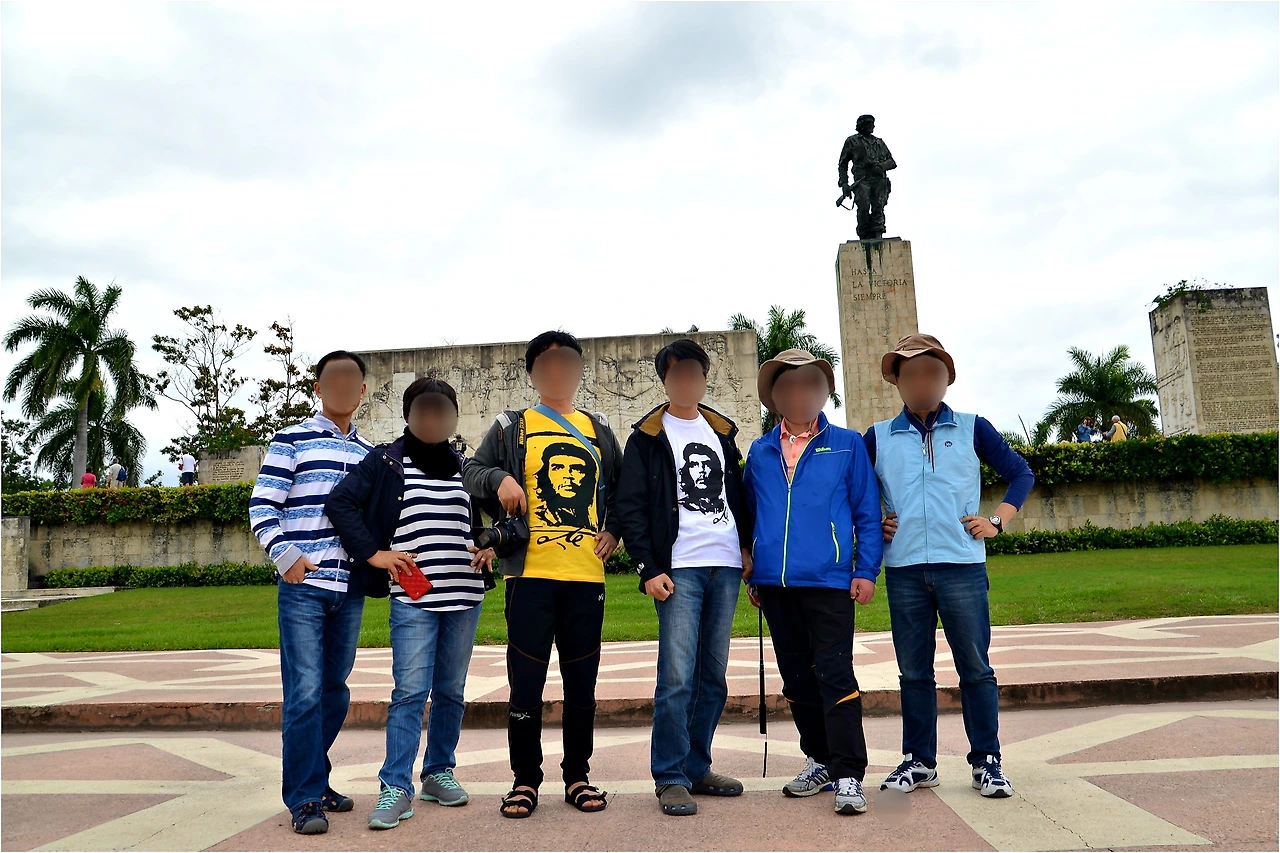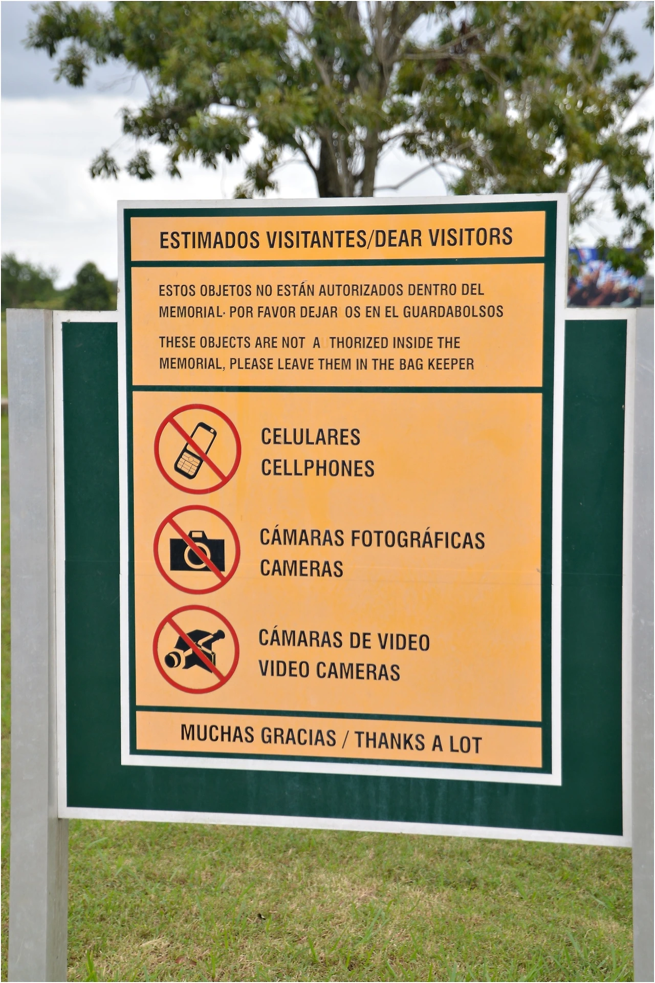 체 게바라 기념관 외부의 풍경(왼쪽). 너른 광장에 우뚝 선 체 게바라의 동상이 인상적이었다. 기념관 내부로 가는 길에 서 있는 경고 안내판(오른쪽) 모든 짐은 차에 두고 카메라만 들고 나섰다. 너른 광장 앞에 체 게바라의 동상이 우뚝 서 있어 그 앞에서 사진을 찍기 위함이었다. 기념관은 살짝 미뤄두고 일단 동상 앞으로 가서 기념 사진들을 찍기 시작했다. 무엇보다 압권은 미리 준비해 놓았던 체 게바라 티셔츠를 입은 도사님과 총무님이었다. 티 앞면에 새겨진 체 게바라의 모습과 사람들 뒤로 우뚝 서 있는 체 게바라의 모습이 넓은 광장을 채우는 듯했다. 미국에 맞서 혁명을 만들어내었고 그들과 당당한 대결을 펼쳤고 지금까지 나름의 방식으로 국가를 유지하며 생존해왔던 쿠바인들에 대한 존경심(?)이 생겼다.