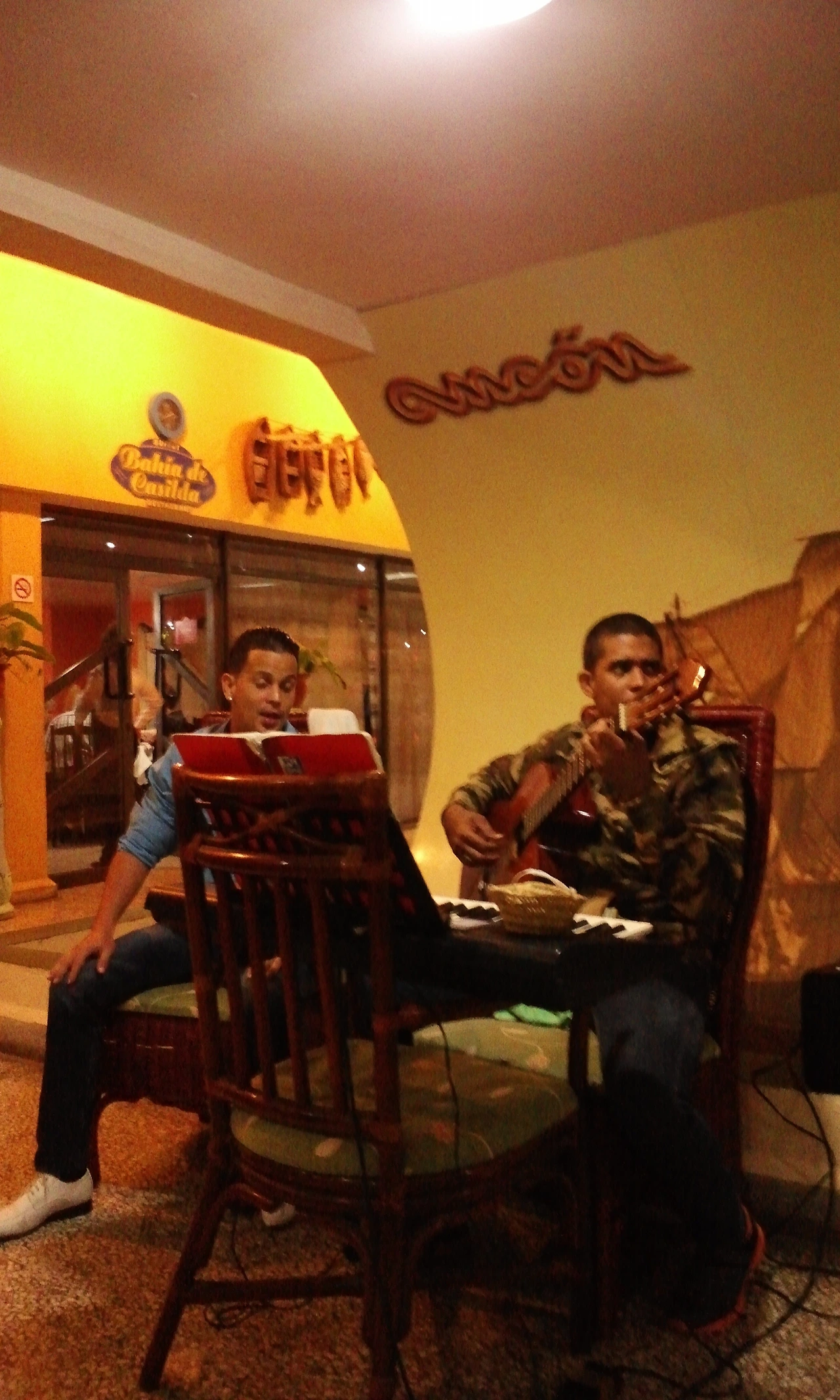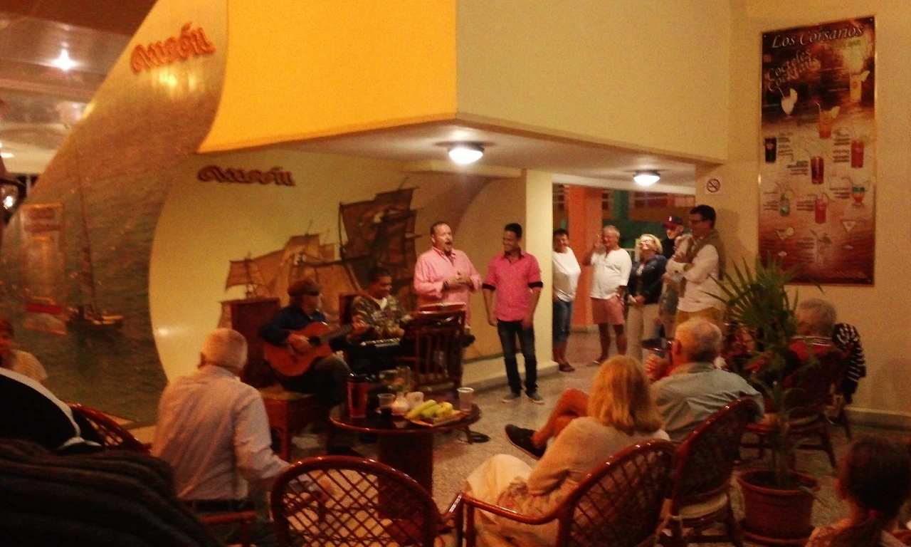 식사 후에는 식당 옆에 있는 바에서 칵테일을 한 잔씩 무료로(!!) 마시면서 작은 음악 공연(너무 거창한 표현일 수 있겠다. 바 옆 작은 공간에서 두 명이 기타 연주하며 노래를 하고 있었다.)도 즐겼다. 이어서 중년 남성이 그 덩치만큼이나 묵직한 목소리로 성악 공연을 시작했다. 너무나도 자유롭고 여유와 흥이 넘실대는 분위기였다. 카리브해를 마주한 휴양지임을 마음껏 느낄 수 있는 분위기를 여행객들이 스스로 만들어내고 있었다. 옆에서 이런 분위기를 함께 즐기던 한 할머니와 대화가 시작되었다. 캐나다에서 왔다고 하는 할머니(70세라고 하기엔 너무 젊어 보였다)는 남편과 함께 이곳으로 휴양 여행을 왔다고 했다. 그 부부와 서로의 나라에 대한 이야기도 하고 사진도 찍고 하면서 호텔을 여유롭게 즐겼다. 호텔의 여행객은 대부분 백인의 서양인이었고 그 중 80% 이상이 캐나다인이라고 했다. 2016년 이때까지만 해도 미국인도 거의 없고 유럽인도 거의 없었다. 오죽하면 이때만 해도 US달러는 환전이 안되고 캐나다 달러가 외국화폐로 더 일반적이었다. 그래서 우리 팀도 캐나다달러를 들고 쿠바에 갔었다.