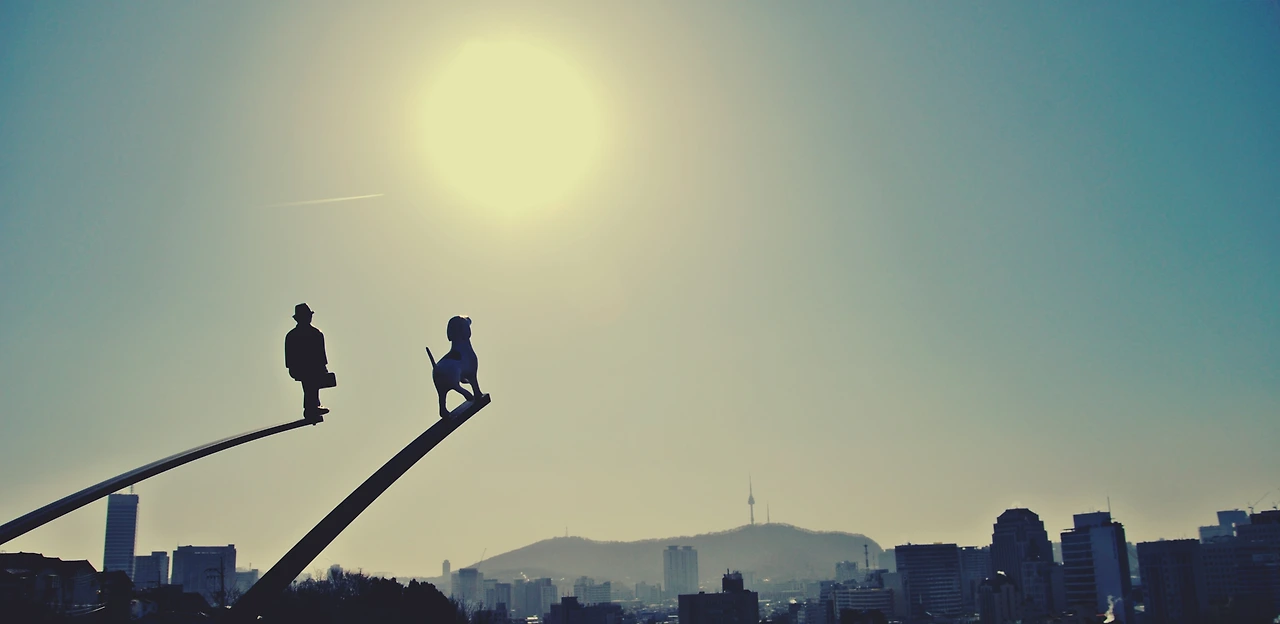 2009년 겨울이었다. 카메라를 둘러메고 피사체들을 찾아 움직이는 일에 열정적이었던 그날은 서울 시내 구석구석을 찾아보기로 했다. 혜화역을 등지고 비탈길을 걸어올라 낙산공원을 향했다. 공원 너머 성벽길도 걸어보고 그 너머에 있는 창신동 재개발 예정 구역도 돌아볼 심산이었다. 낙산공원까지 오르는 길은 꽤나 가파르고 길었다. 운동 부족을 절감하며 바빠진 호흡과 함께 공원에 도착했다. 잠시 숨을 고르고 공원 이곳저곳을 둘러보기 시작했다. 예술가들의 작품이 여럿 설치되어 있었고 그중 하나가 나의 눈과 카메라를 이끌어 당겼다. 철판으로 만든 좁다란 길 끝에 중절모를 쓴 신사가 빨간색 서류가방을 들고 걸어가고 있었다. 그 옆에 나란히 난 길을 따라서는 얼룩무늬 달마티안 한 마리가 같을 곳을 보며 걷고 있었다.