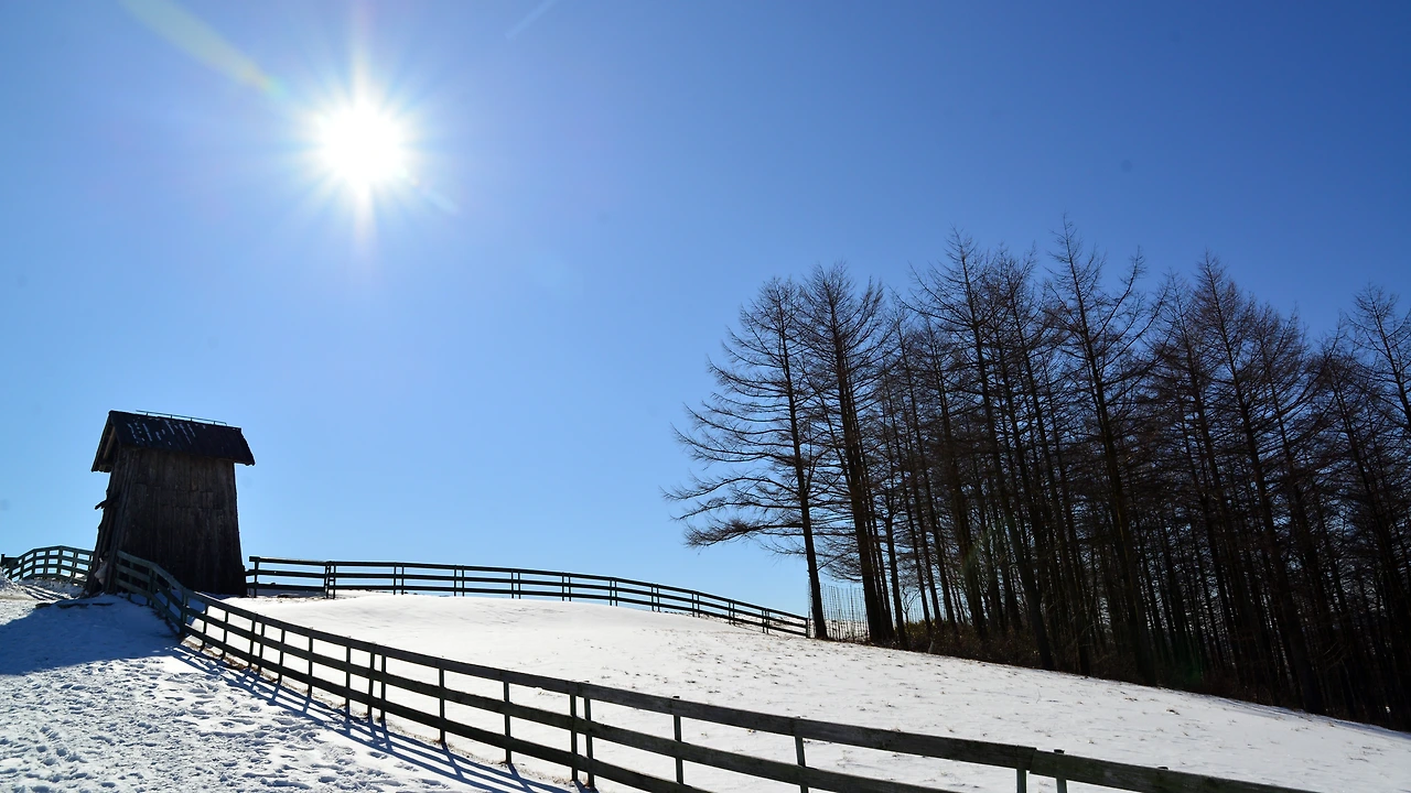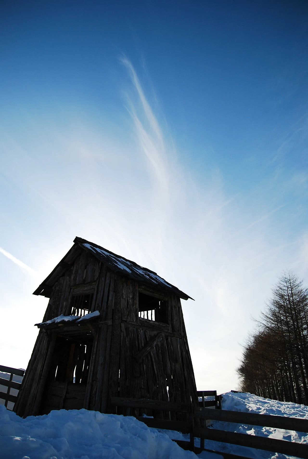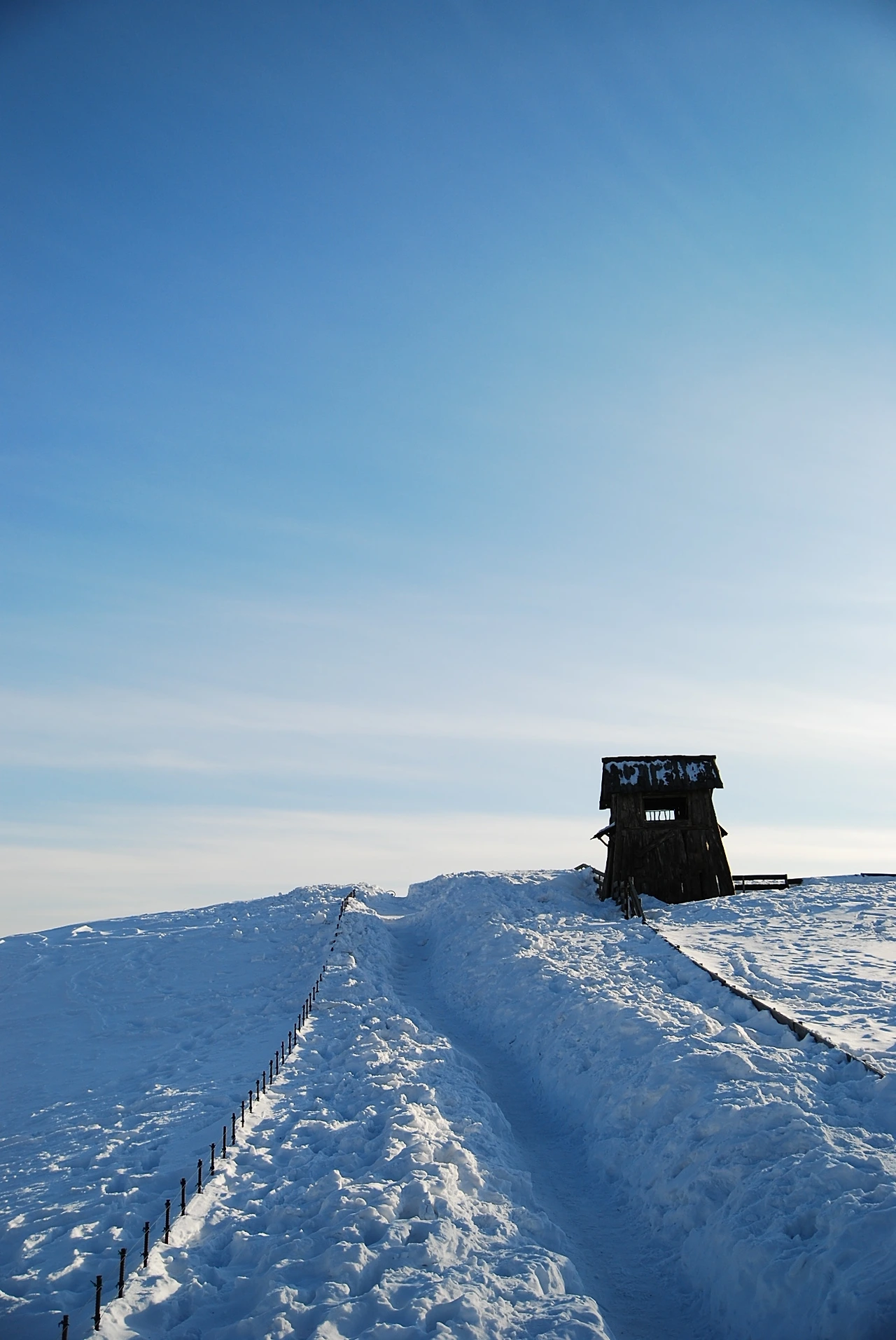 벤치에서 고마움을 느끼며 다리를 잠깐 쉬고 오르락내리락 길을 따라 걷다 보면 창고인지 초소인지 뭐 하여튼 그렇게 보이는 작은 목조 구조물이 하나 나타난다. 겉을 보나 그 안을 살펴보나 뭐 그리 대단한 건물은 아니다. 다만 마치 이 아름다운 설경을 완성시켜 주기 위해서 그런 것처럼 완벽한 자연의 아름다움을 만들어내는 소품의 역할을 충실히 하고 있었다. 더구나 맑게 개인 하늘과 붓터치처럼 생겨난 구름들을 뒷배경으로 두고 아래로는 하이얀 눈밭과 그 속의 작은 길, 그리고 길을 따라 이어진 목책이 있어 이 건물은 이곳을 겨울 동화 속 배경지로 완성시키고 있었다. 자연이 도와준 날씨와 풍경에 이 작은 구조물이 더해져 완벽한 겨울 동화의 설경을 만들어 낸 것이다.