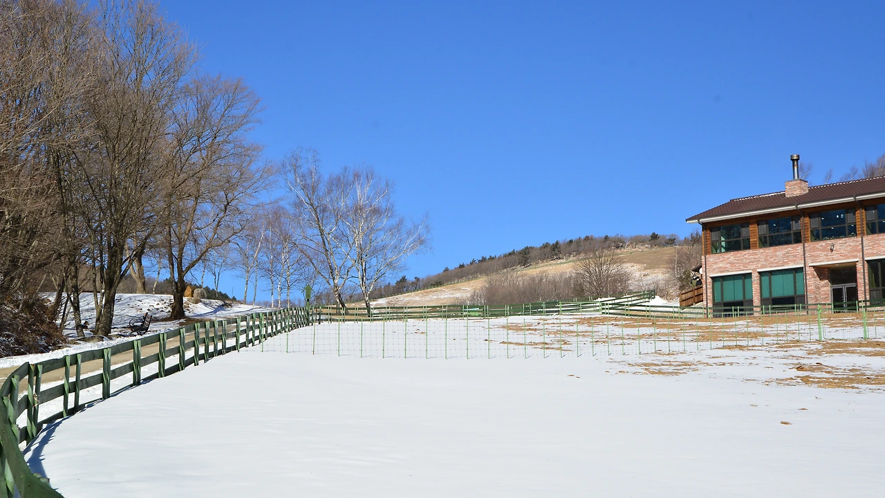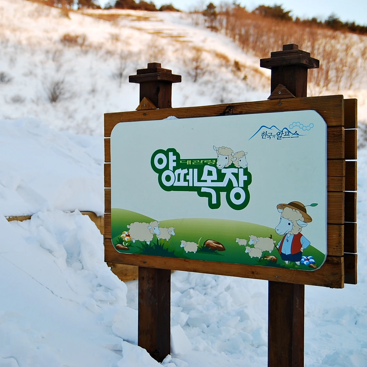 언덕 위 산책길을 걷고 걸어 입구의 정반대편까지 걸어가면 양떼목장에서 가장 높은 곳에 이르게 된다. 그리고 고개를 돌려 입구 쪽을 바라보는 순간 이곳의 전경이 한눈에 들어온다. 가운데 움푹한 곳에 양들이 모여있는 집이 보이고 그 뒤 언덕 위에는 아까 보았던 작은 건물들도 보인다. 그리고 무엇보다 기가 막힌 것은 이 양떼목장 너머로 펼쳐지는 산들의 모습이다. 강원도의 그 산들은 겹겹이 이어지며 능선들을 잇고 이어 아름다운 곡선미를 뽐내고 있었다. 2008년 그때는 눈이 더 많아서 더 멋진 풍경을 보였었는데 나의 카메라 기술이 부족해 파노라마 사진으로 담지 못한 것이 뒤늦게 안타까울 지경이다. 하얗게 펼쳐진 산의 능선들이 파아란 하늘과 대비되면 외국 그 어디와 비교해도 뒤처지지 않을 만큼의 아름다움을 맛볼 수 있다. 더욱이 우리의 산은 스위스나 뭐 이런 데와는 달리 곡선미 탓인지는 모르겠으나 웅장함보다는 포근함이 느껴져 더 마음에 다가오는 느낌이다. 이곳에서 딱 그런 느낌을 받을 수가 있었다.