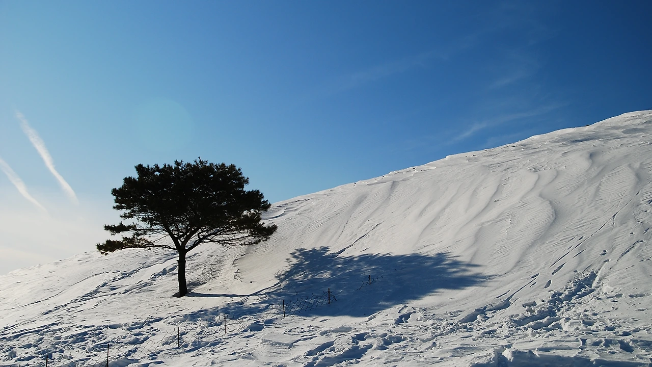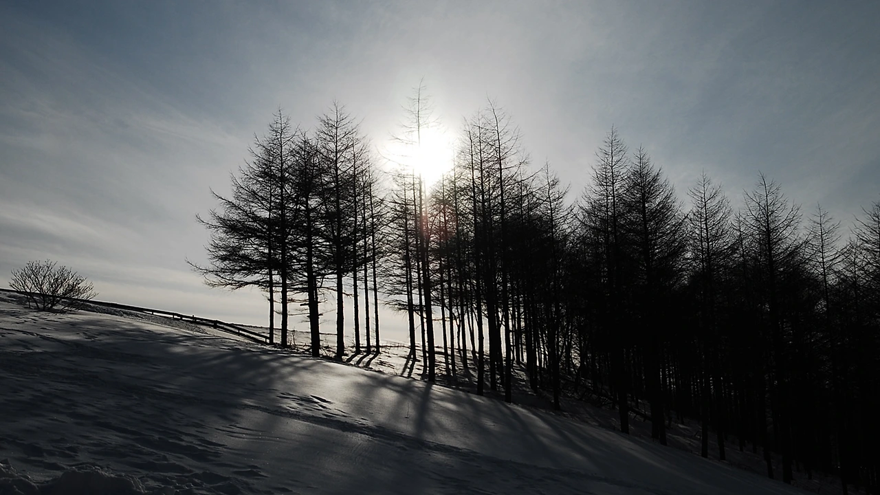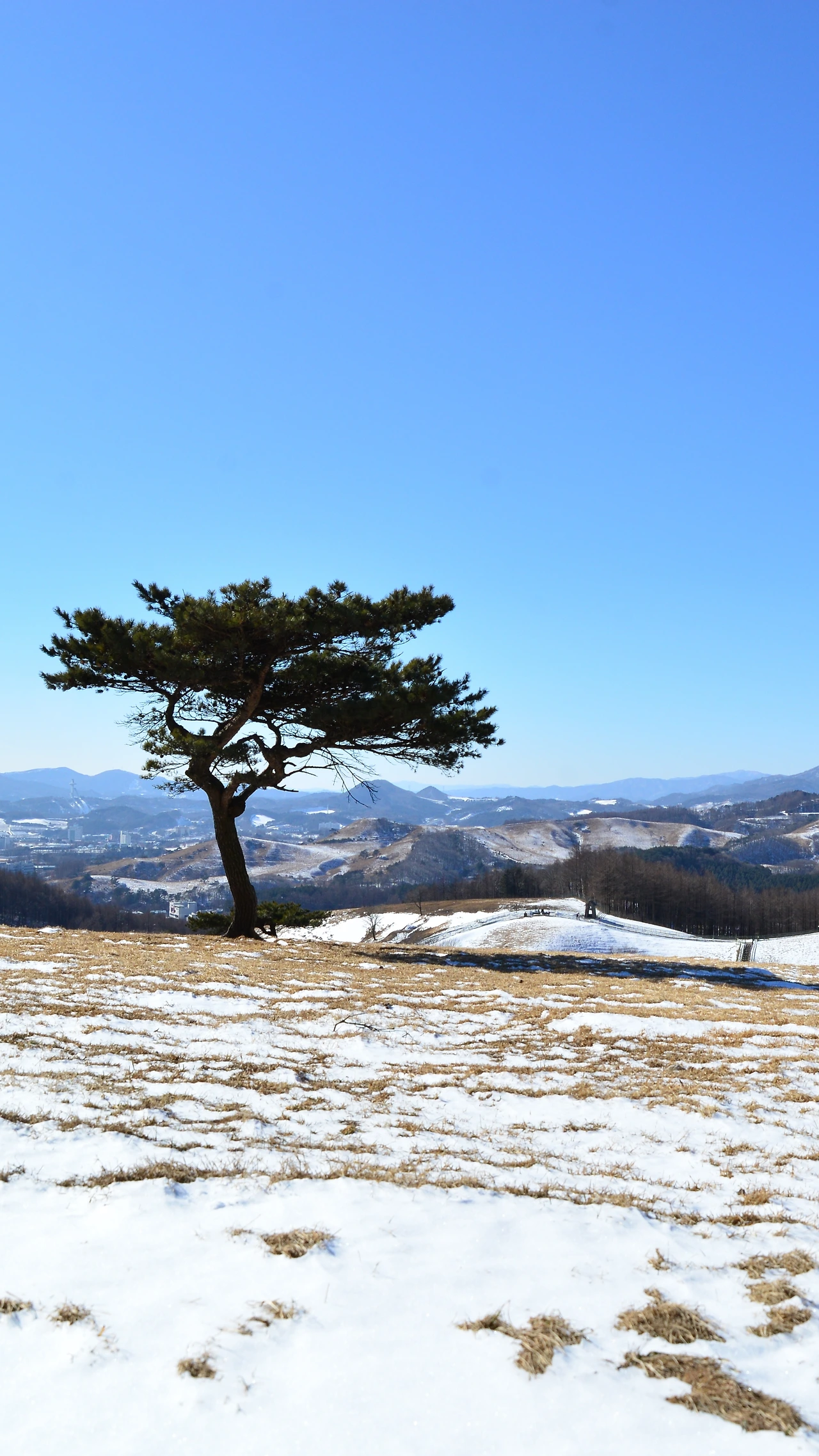 양떼목장을 둘러싸고 있는 언덕을 향한 계단이 나타나고 그 계단을 따라 걸어 올라가면 확 트인 설경이 펼쳐지기 시작한다. 그리고 얼마 뒤 울타리 너머 푸른 나무 하나가 서 있는 장면이 나타난다. 엊그제 내린 눈으로 온통 새하얗게 바뀐 풍경 속에서 홀로 푸르게 서 있는 그 나무는 어딘가 모르게 나를 경건해지게 하는 느낌마저 들게 했다. 한참을 그 앞에 서서 바라보고 있노라면 시간이 멈춘 듯 세상이 고요해지며 약간은 고즈넉한 고독감이 아름답게 피어나는 듯한 느낌을 받는다. 그래서 계속 멍하니 바라보게 하는 풍경이 되었다. 그러다보니 이제는 하얀 눈밭과 푸른 하늘을 배경으로 독야청청 빛나는 이 나무가 양떼목장을 떠올릴 때마다 가장 먼저 떠오르는 장면이 되었다.