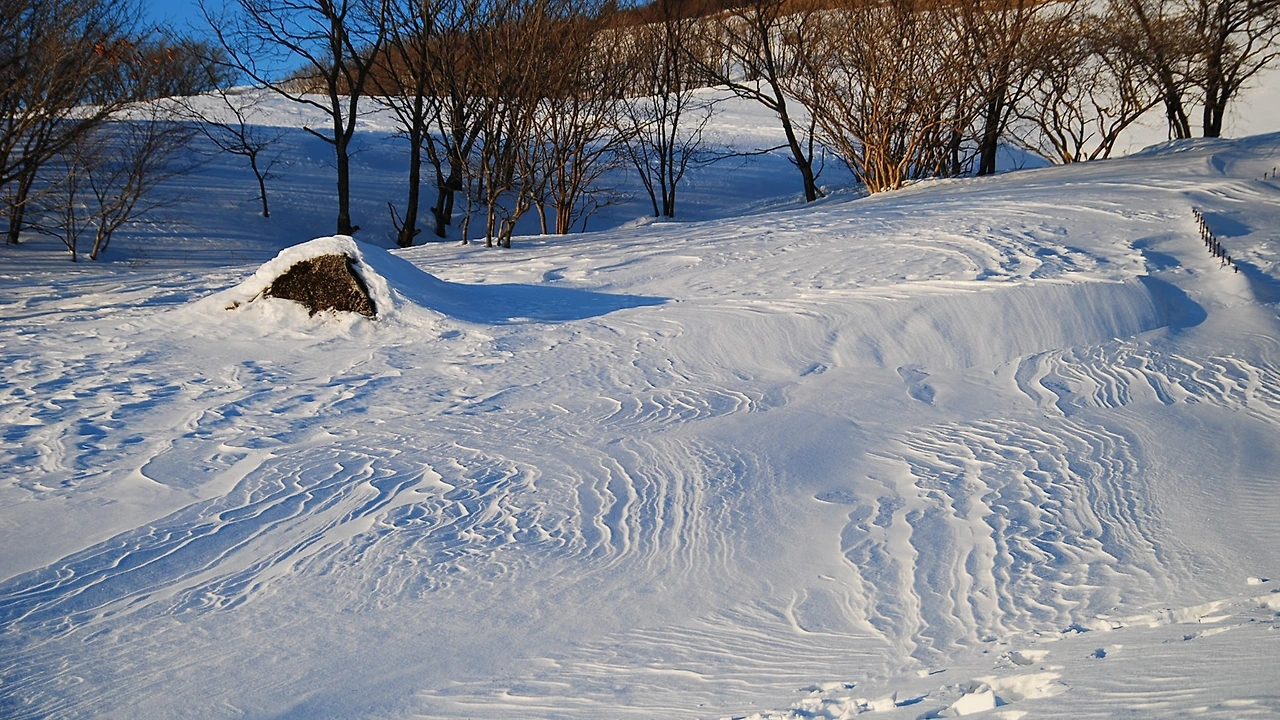 전경을 한참이나 감상하고 주변을 둘러보며 찬찬히 내려오다 보니 자연이 빚어낸 또 다른 신기한 장면이 나타났다. 멋들어진 소나무가 하나 외롭게 서 있는 그 들판에 눈이 많이 쌓였고 거기에 세찬 바람이 불어 다시 눈을 가져다 쌓으면서 물결이 생겨난 것이다. 마치 하늘에서 바라본 어느 바닷가의 파도가 흰 포말을 일으키며 해안선으로 달려드는 듯한 느낌의 모양이 생겨난 것이다. 그 모양을 주변 사물들을 다 빼고 눈만을 찍어 보니 마치 어느 추운 행성의 표면 같은 느낌마저 들었다. 정말로 날씨와 시간이 만들어낸 경이로운 장면이었다. 2008년 이후에도 몇 번 이곳을 찾았지만 그 이후에는 한 번도 만나지 못한 장면이다. 언제 또 이런 신비한 풍경을 만날 수 있을지 모르겠다. 하기야 가끔씩 듬성듬성 찾는 이에게 자연이 쉬이 내어놓을 수는 없는 노릇이니…….