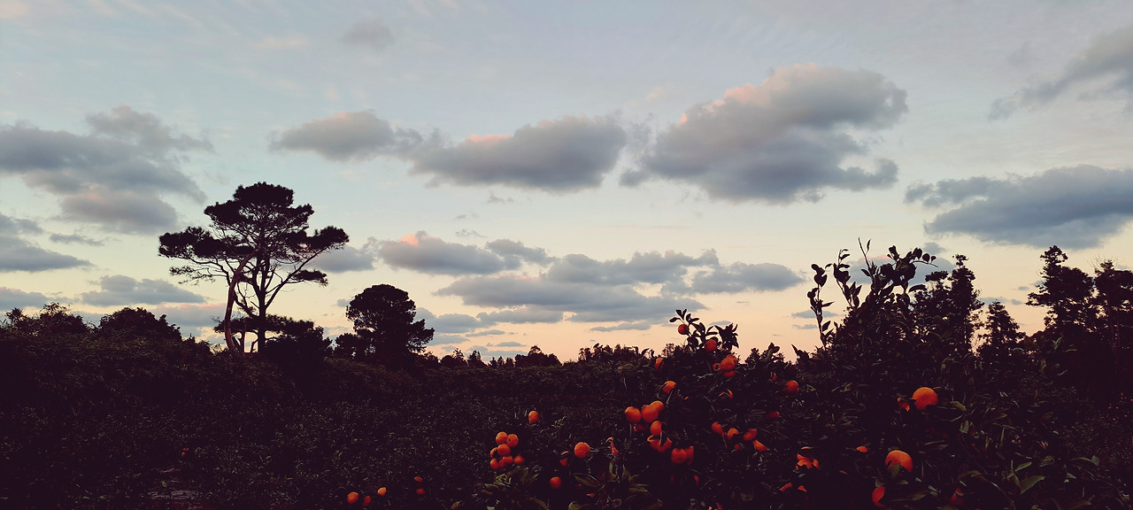 참 좋아하는 풍경이고, 참 좋아하는 사진이다. 아마 이 즈음의 계절, 어느 이른 저녁에 찍은 사진일 게다. 나무에는 귤이 제 빛깔을 찾아 예쁘게 익었고, 과수원을 둘러싼 방풍 나무들 사이로 높게 솟은 소나무 한 그루가 적당히 구름 낀 하늘을 배경으로 꼿꼿하게 서 있고, 북쪽 하늘까지 번져온 저녁놀의 색감이 서서히 감귤 색과 닮아가는 바로 그 시점! 카메라는 챙기지 못한 탓에 주머니를 뒤적거려 휴대폰 카메라로 찍은 사진이다. 사진 품질이야 당연히 DSLR을 따라가지 못하지만 이 풍경과 이 사진 자체는 그 어떤 작품 사진보다도 더 깊고 선명하게 마음속에 새겨져 있다.