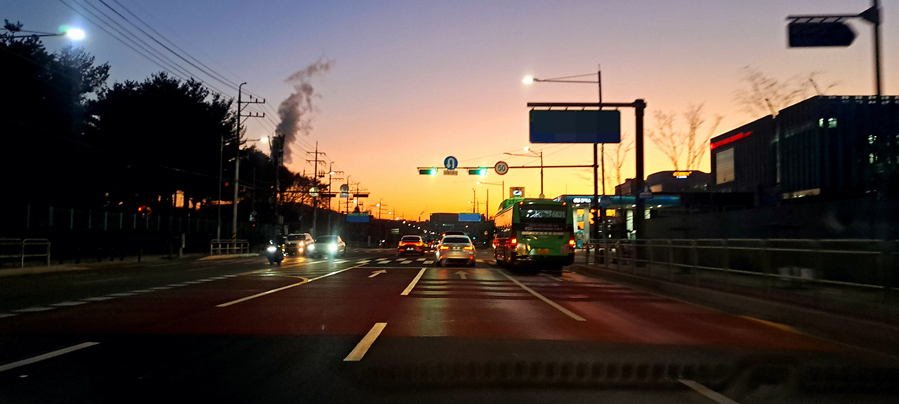 늘 반복되는 일상이지만 그래도 12월과 1월의 출퇴근 길은 다른 때와 사뭇 다르다. 아침마다 일출을 보며 출근하고 저녁마다 일몰을 보며 퇴근하기 때문이다. 낮이 가장 짧은 시기, 그 두 달 정도가 딱 아름다운 하늘을 보며 출퇴근을 하는 시기이다. 때로는 농담처럼 별보며 출근하고 달보며 퇴근한다고 푸념을 늘어놓기도 하지만, 이미 멀겋게 해가 다 떠올랐거나 저녁인데도 지칠 줄 모르고 여전히 밝은 태양이 남아 있을 때보다는 이때가 더 좋다.